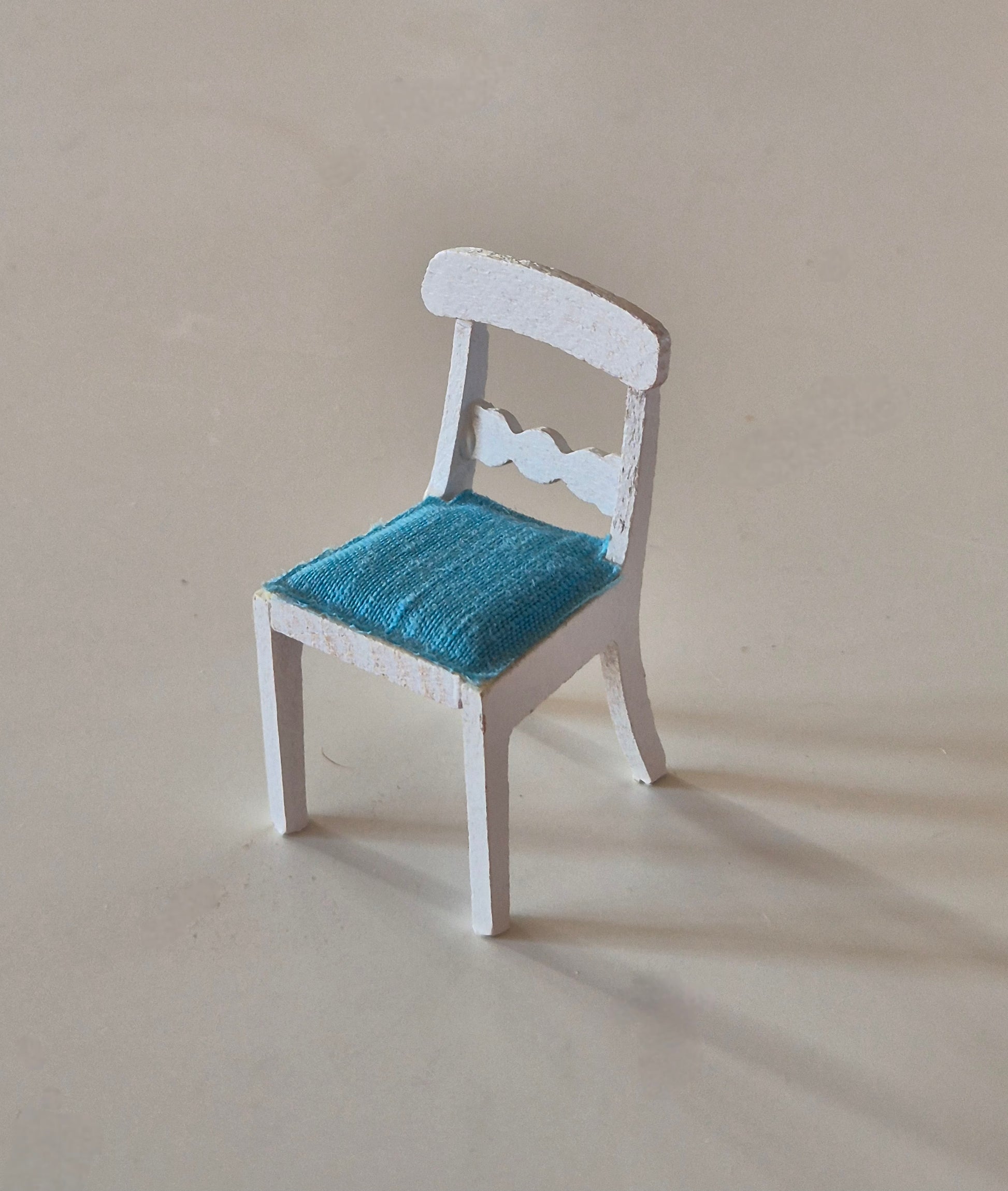 God ældre stol af hvid træ med blåt sæde til fx køkkenet.