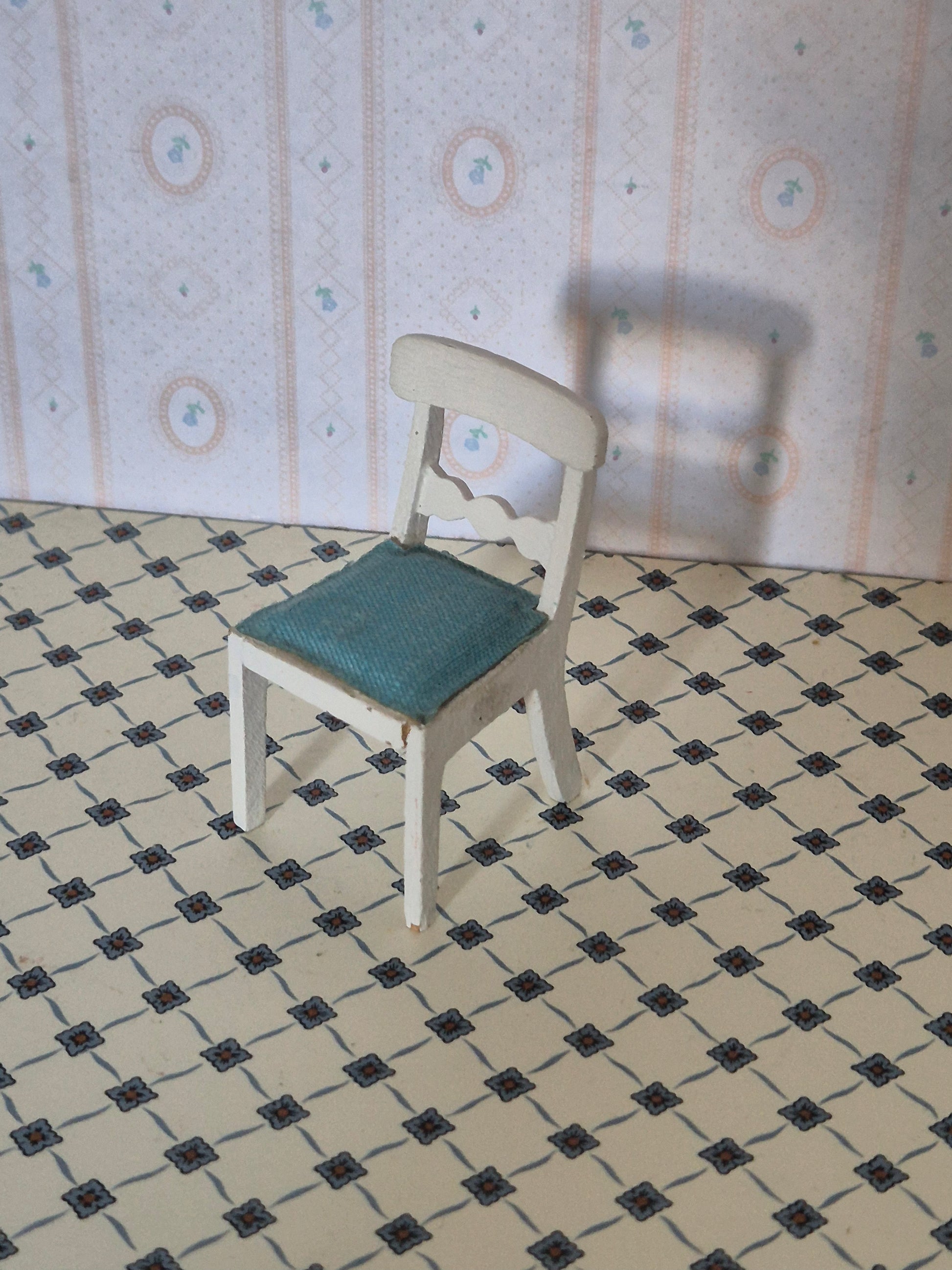 Pæn Lundby stol i hvid med blåt sæde. Der er patina og brugsspor.
