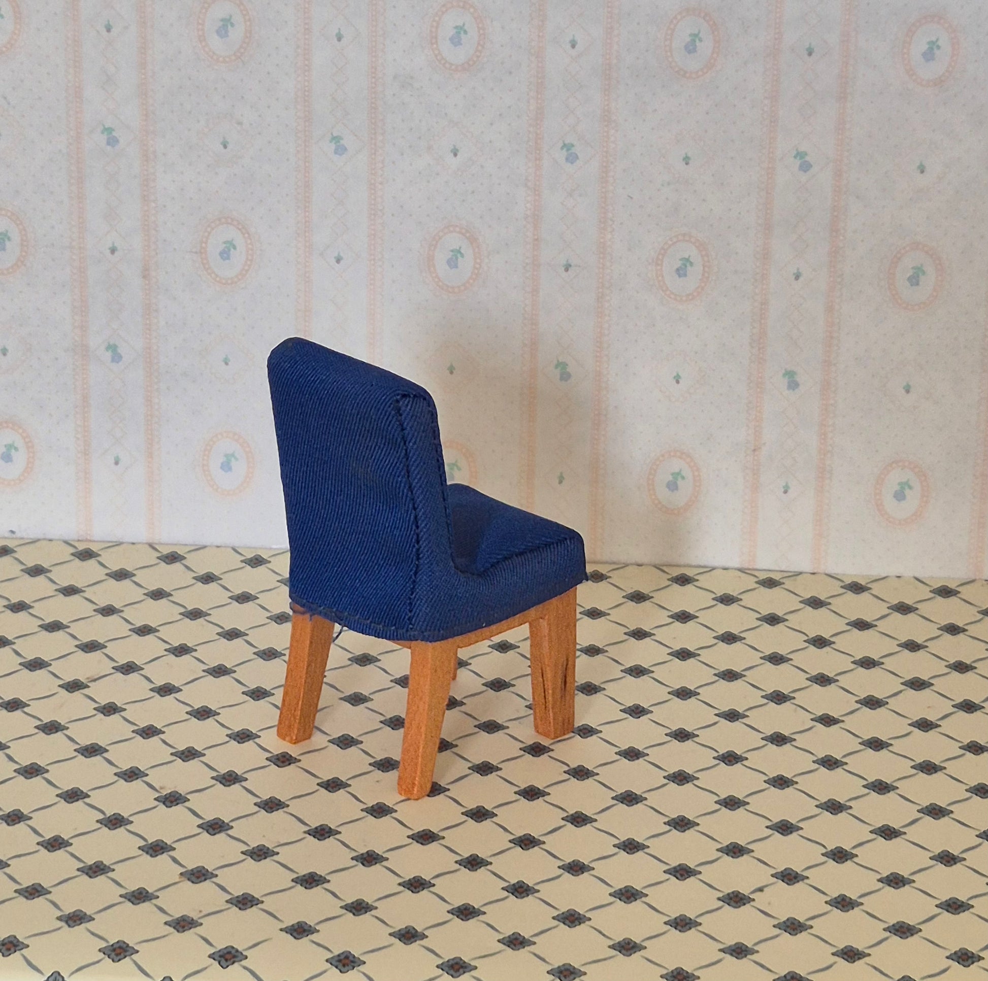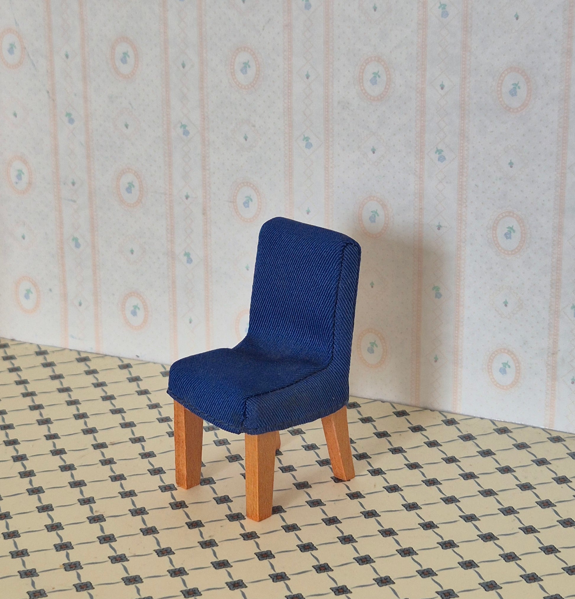 Pæn og god Lundby stol af træ. Den er lakeret med blåt betræk.