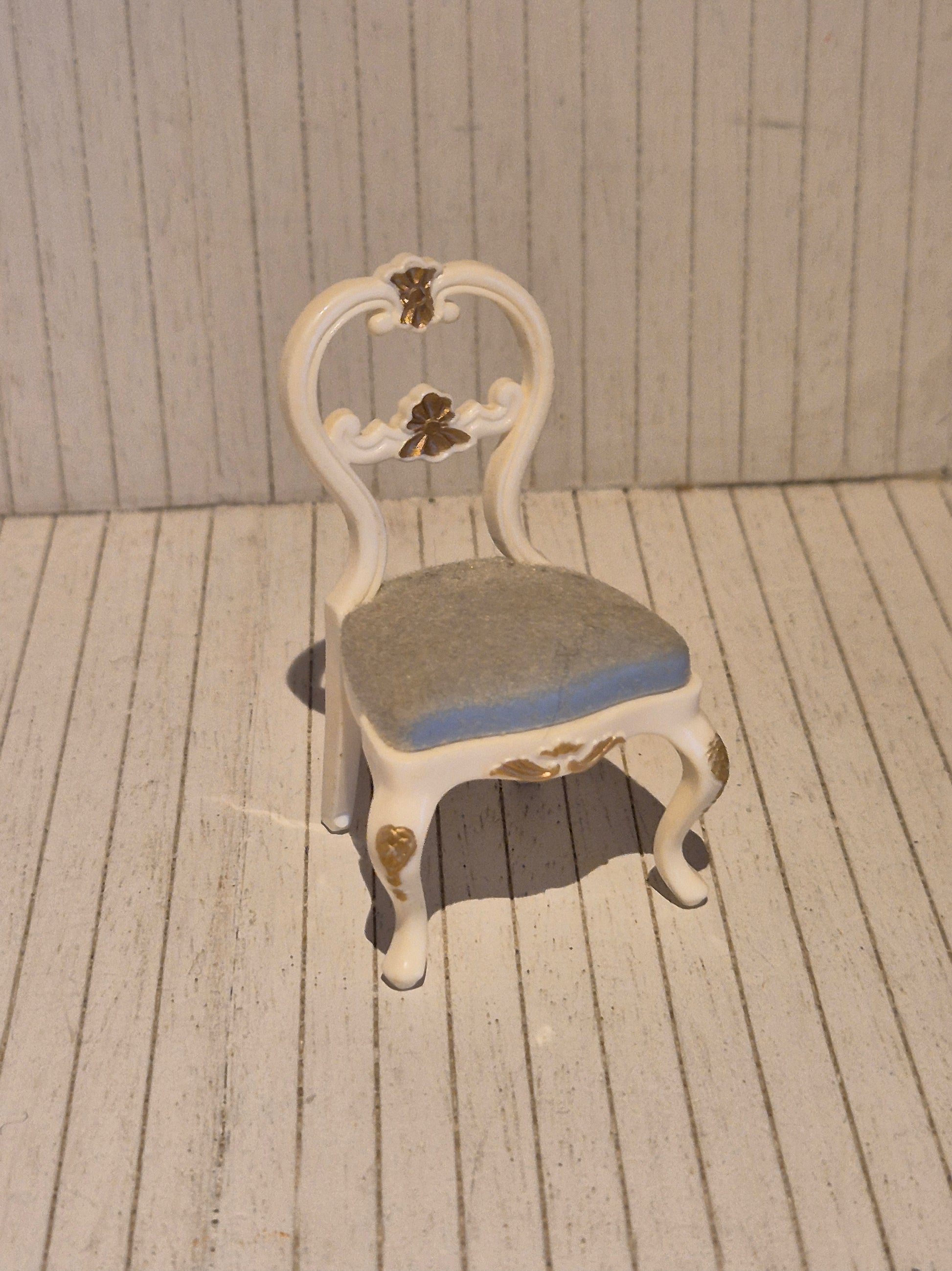 Pæn Lundby stol med lyseblåt sæde, gulligt af patina. God stol med brugsspor til spisestuen eller lignende sted. God fin stand. Rokoko stil.