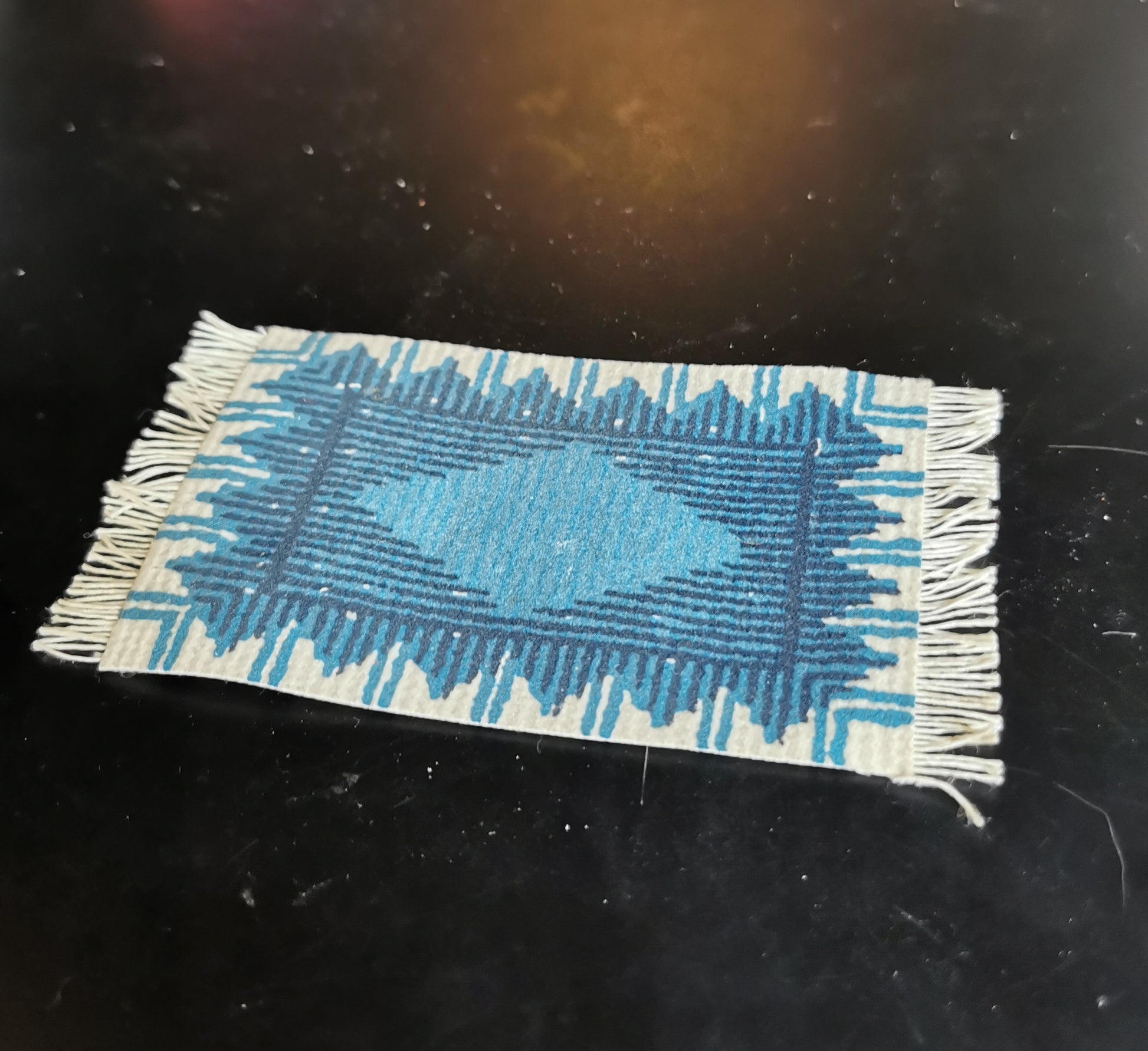 Det er ældre og fint, tykt vævet, blåt og hvidt mønster med frynser. Det er originalt af mærket Lundby.