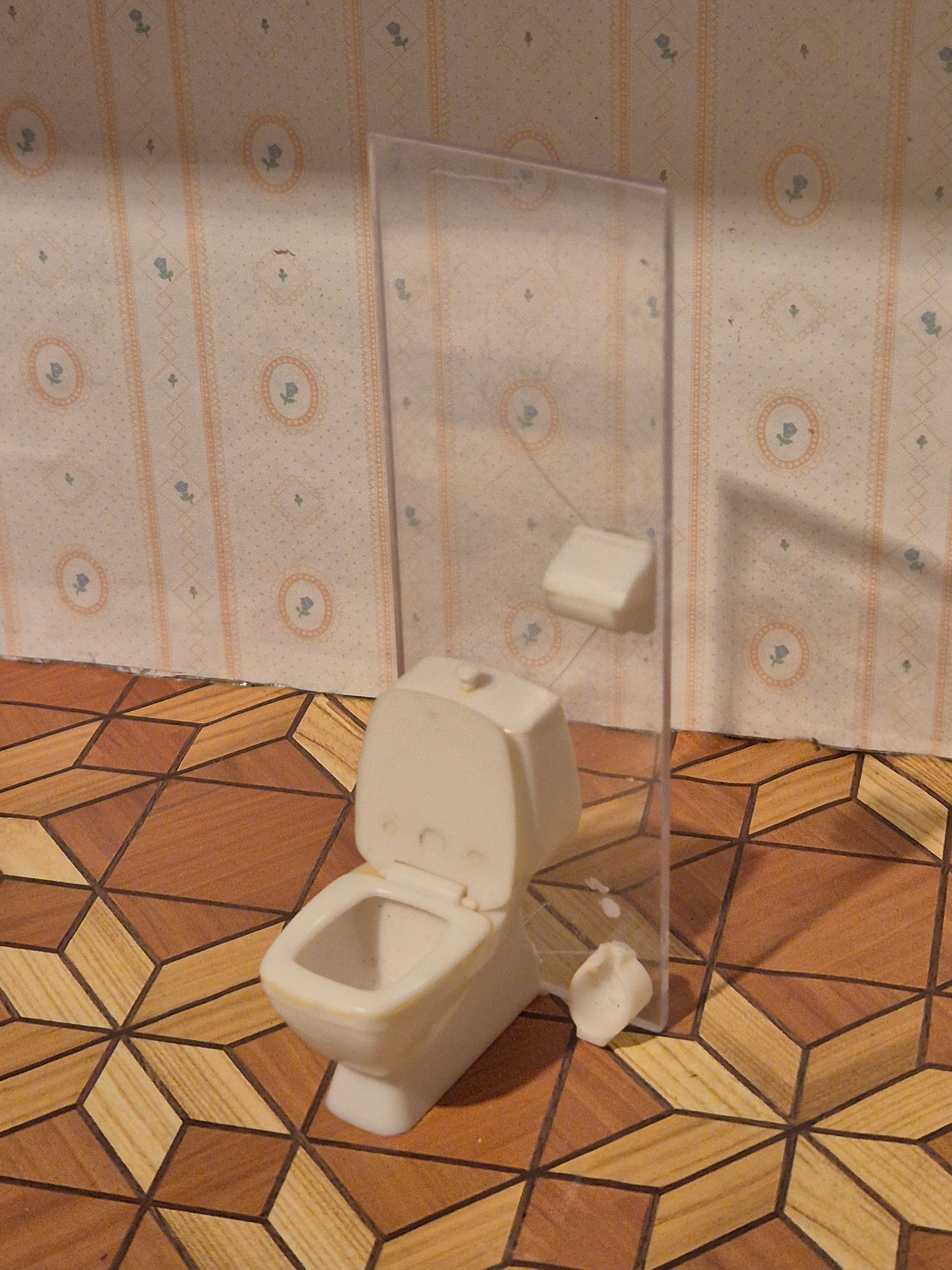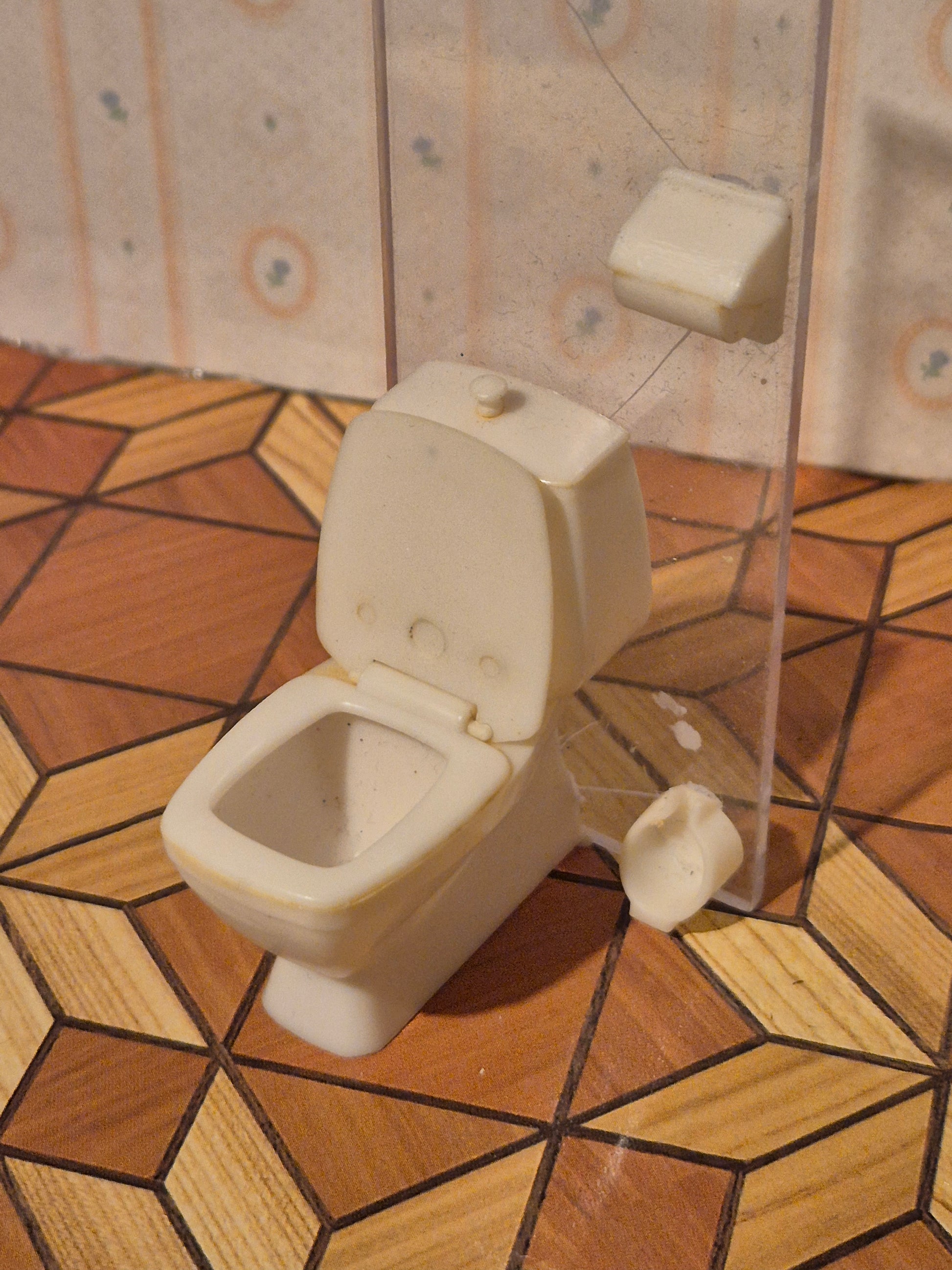 Lundby toilet med gennemsigtig bagvæg. Udmærket stand, brugt, men mangler toiletbørstens stang/håndtag, den er knækket.
