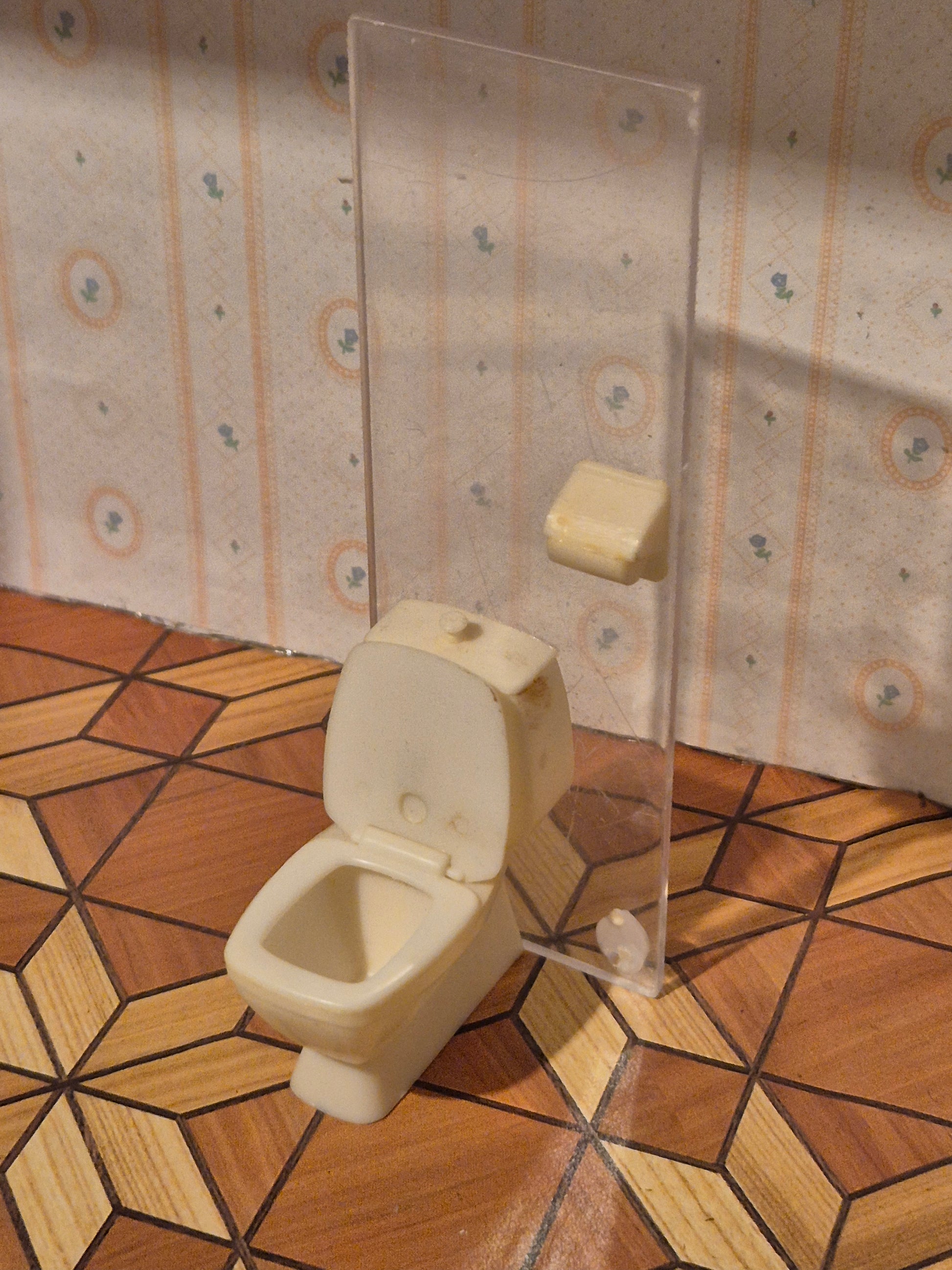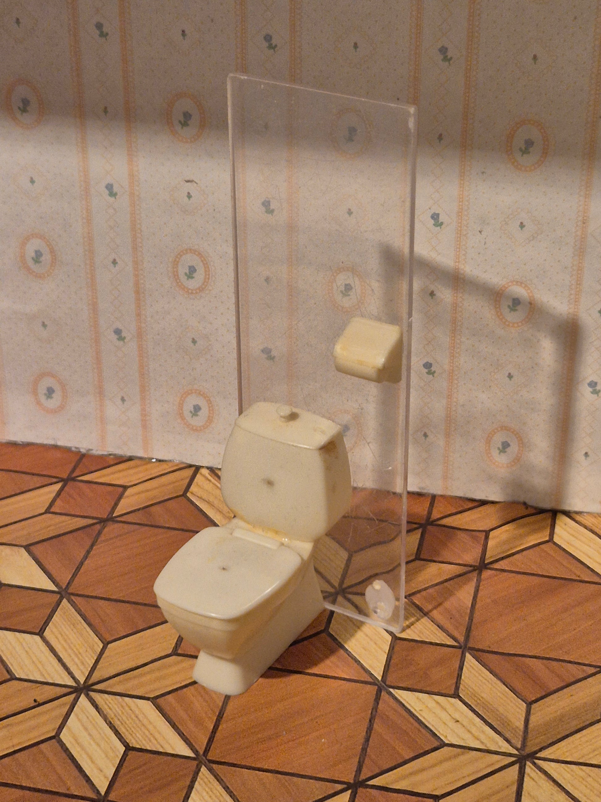Lundby toilet med gennemsigtig bagvæg til badeværelset, brugsspor og patina. Toiletbørste mangler. Der er gammel limrester