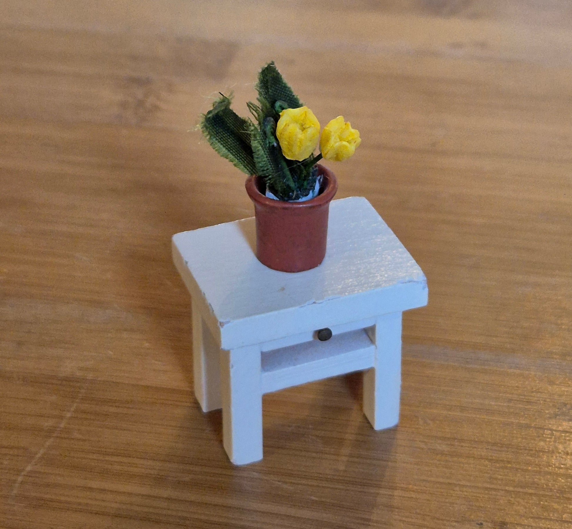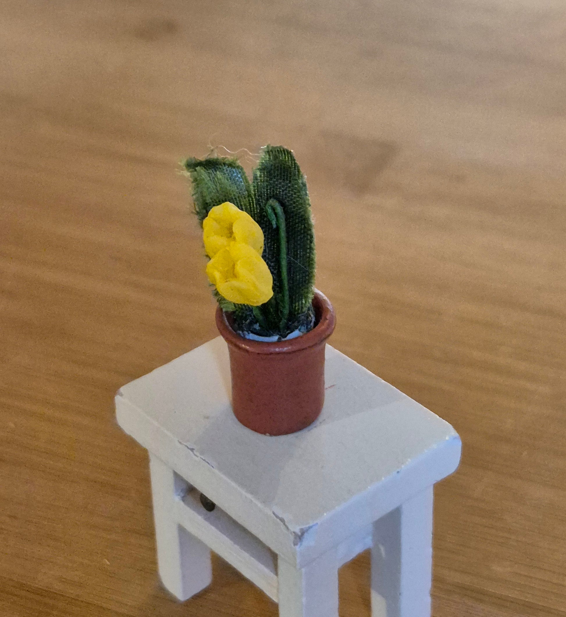 Blomst i brun potte. Gule tulipaner med blade til lundby dukkehuset.