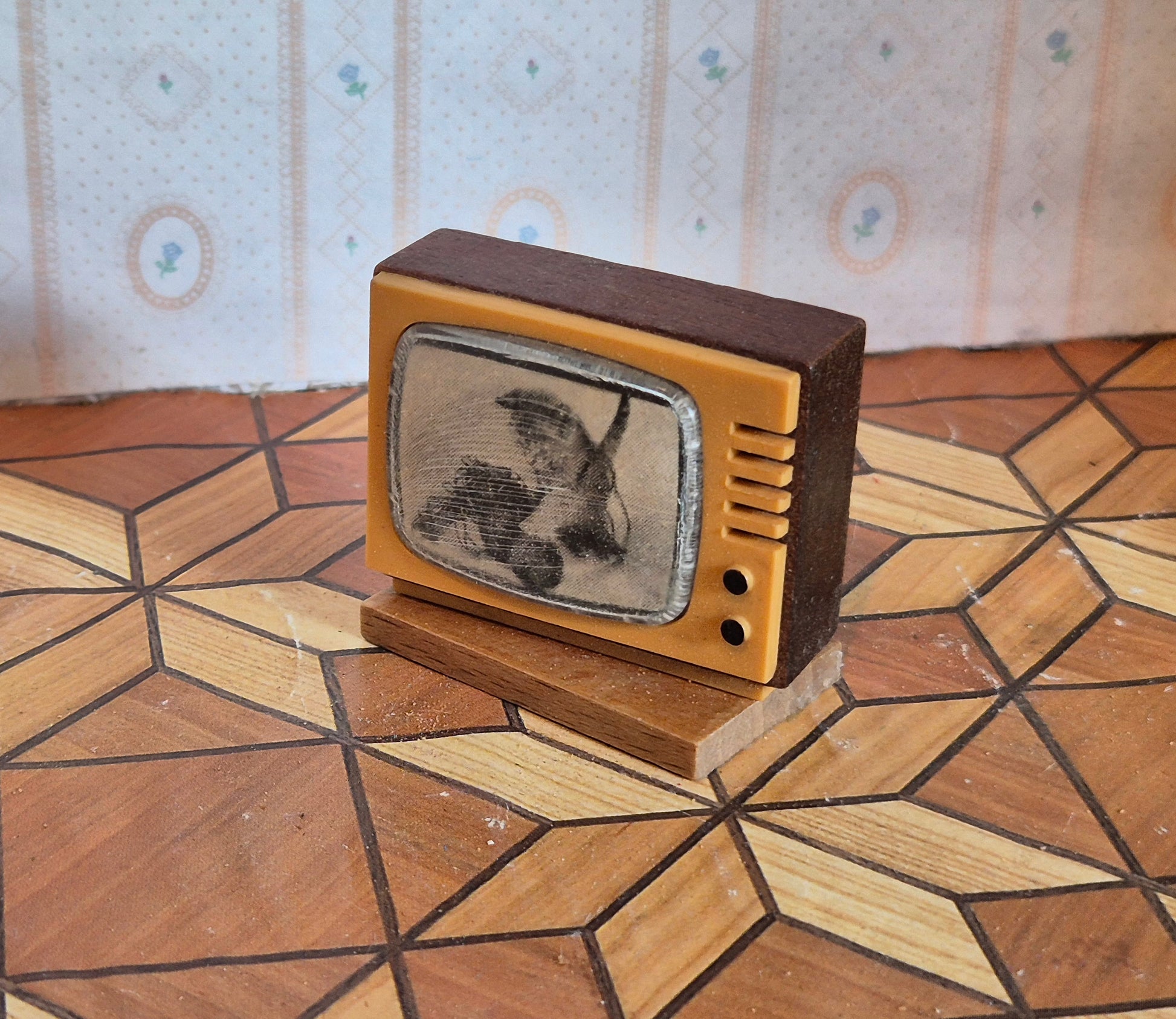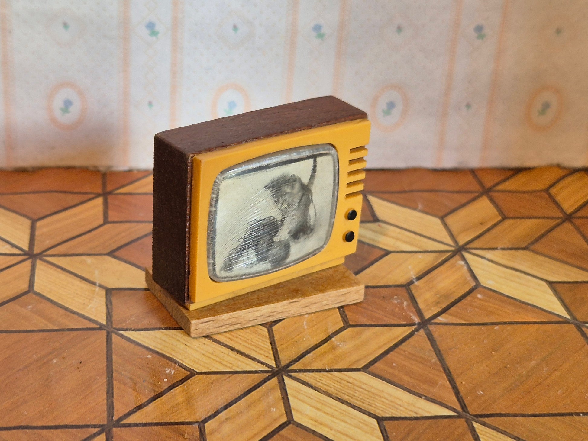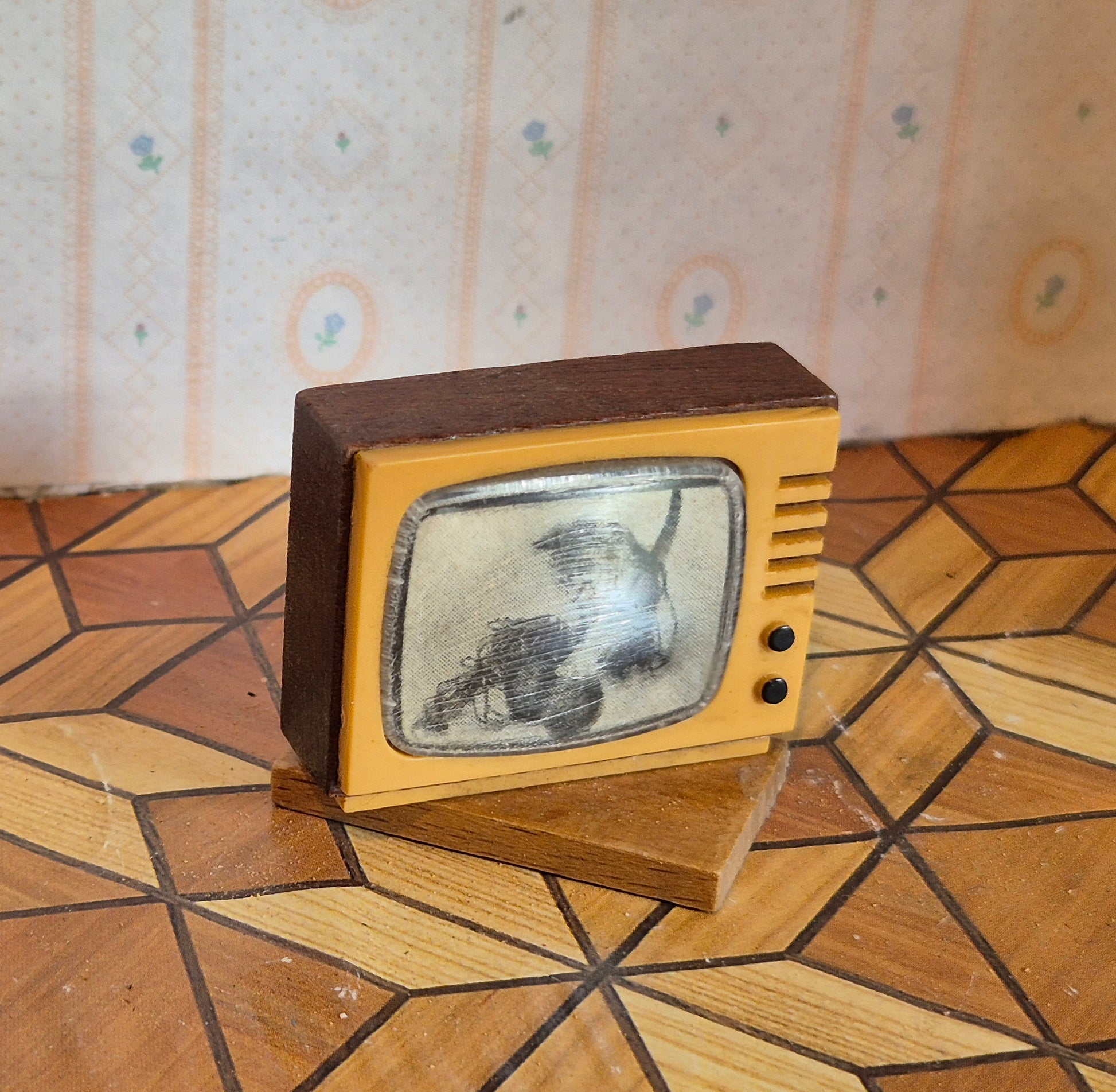 Originalt Lundby TV på drejefod fra 1950-1960erne. Det er gulnet end del gennem tiden, men ellers i god stand. Der er patina.