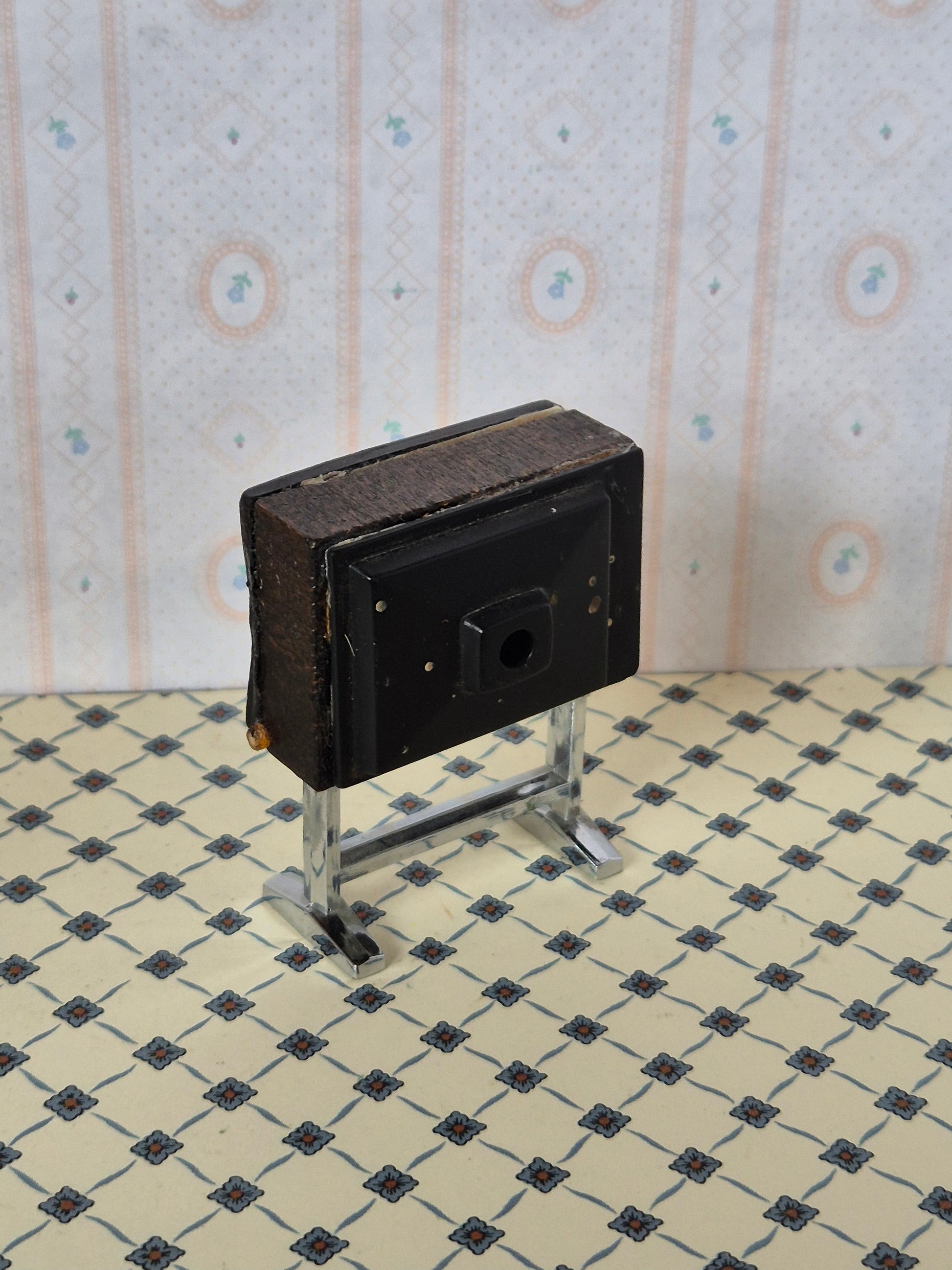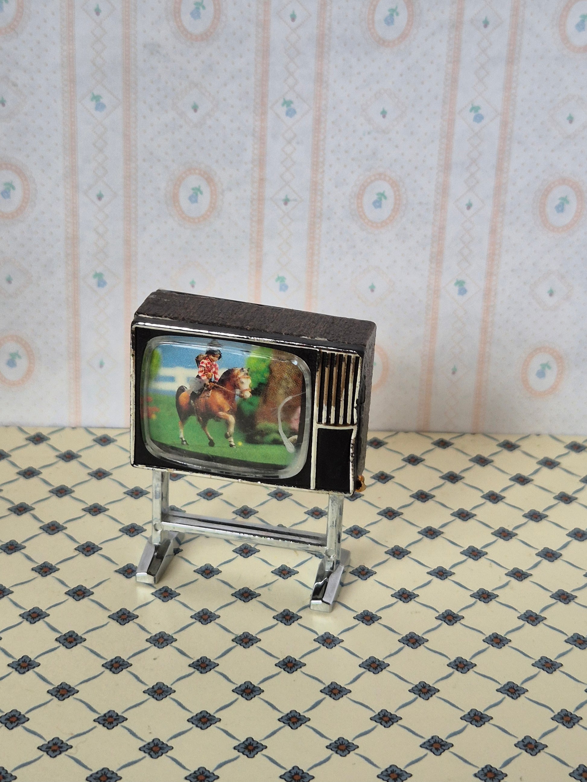 Vintage Lundby TV med slidmærker, patina og brugsspor.