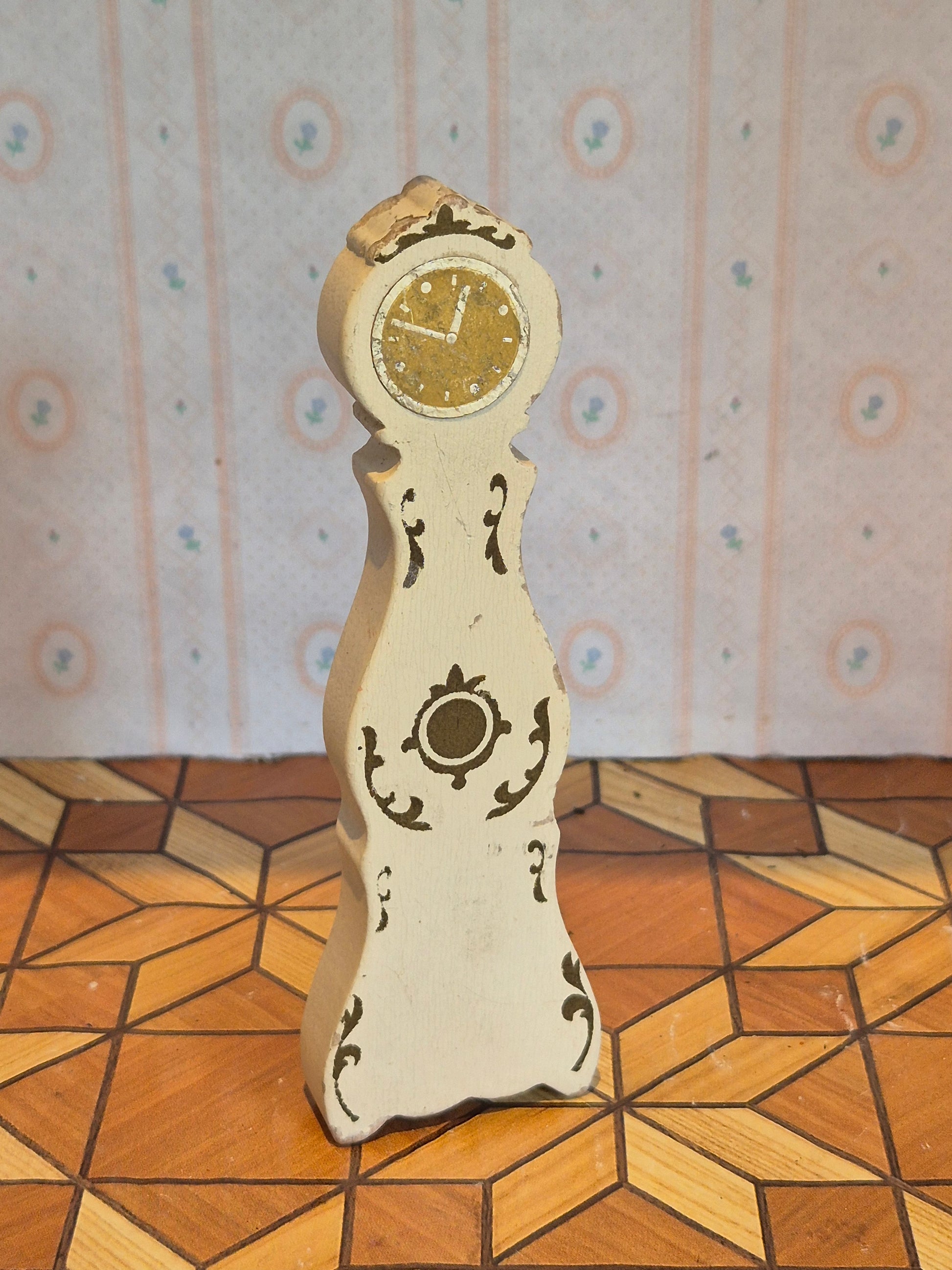 Vintage Lundby ur i hvid rokoko stil med gyldne detaljer. Brugt med patina