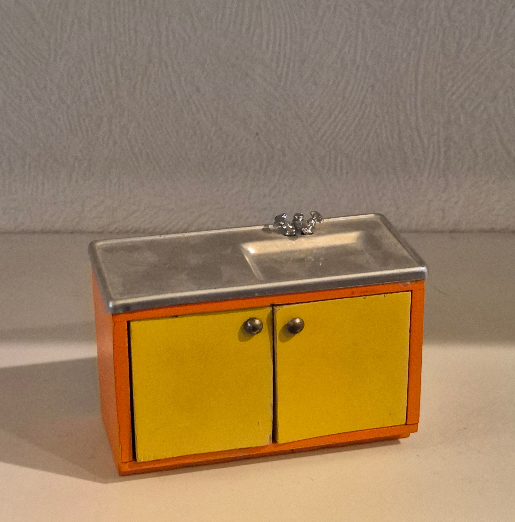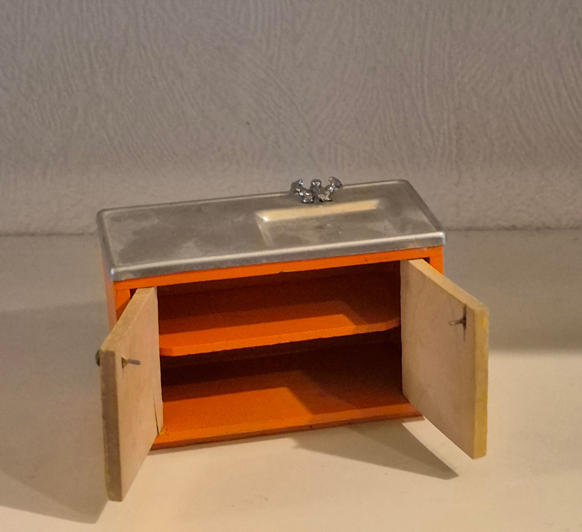 Orange og gult køkken vask skab med metallisk bordplade, vandhane og vask. Det har 2 gule låger med metal greb.