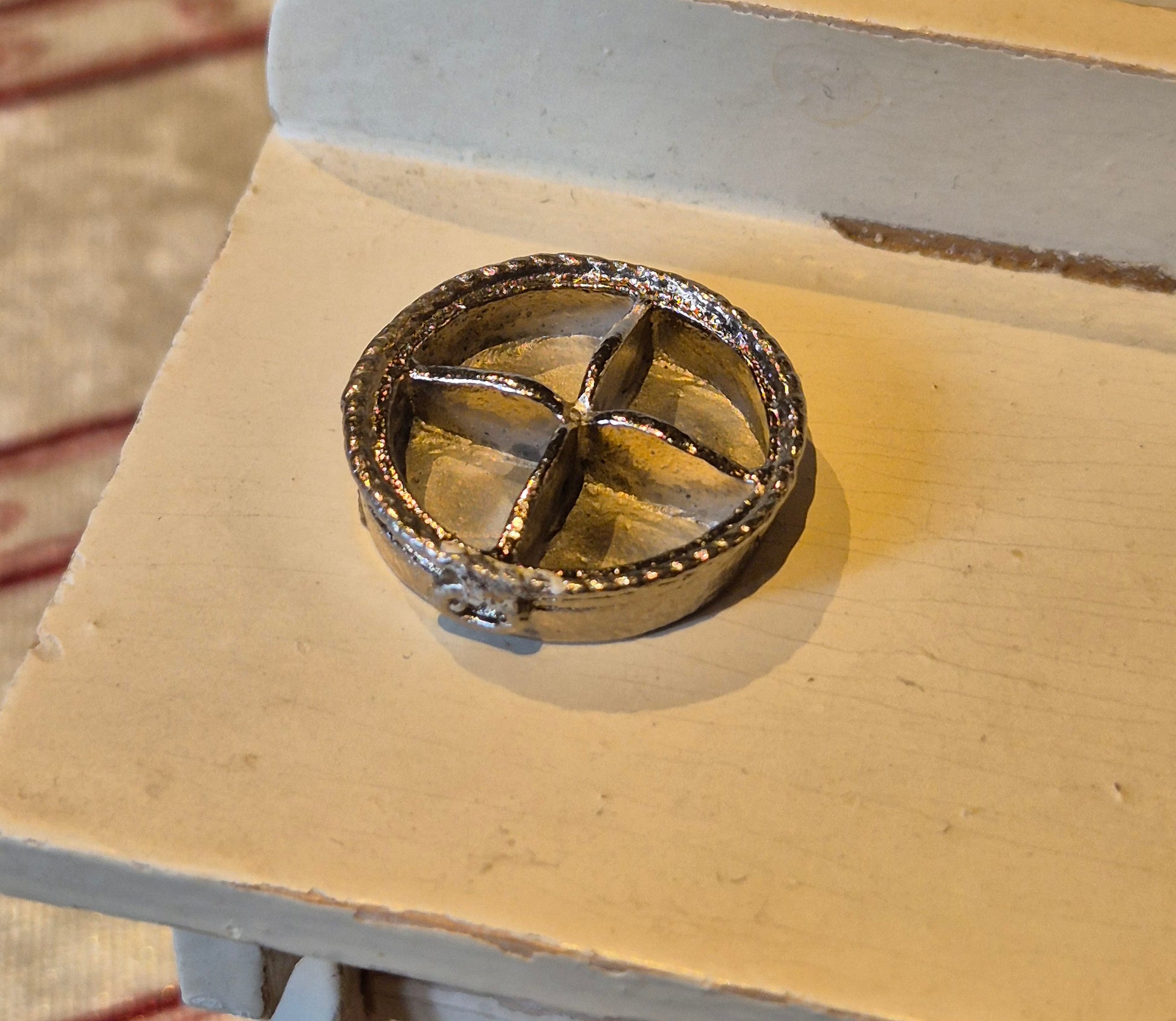 Underdelen af en skål eller terrin af metal / bly.