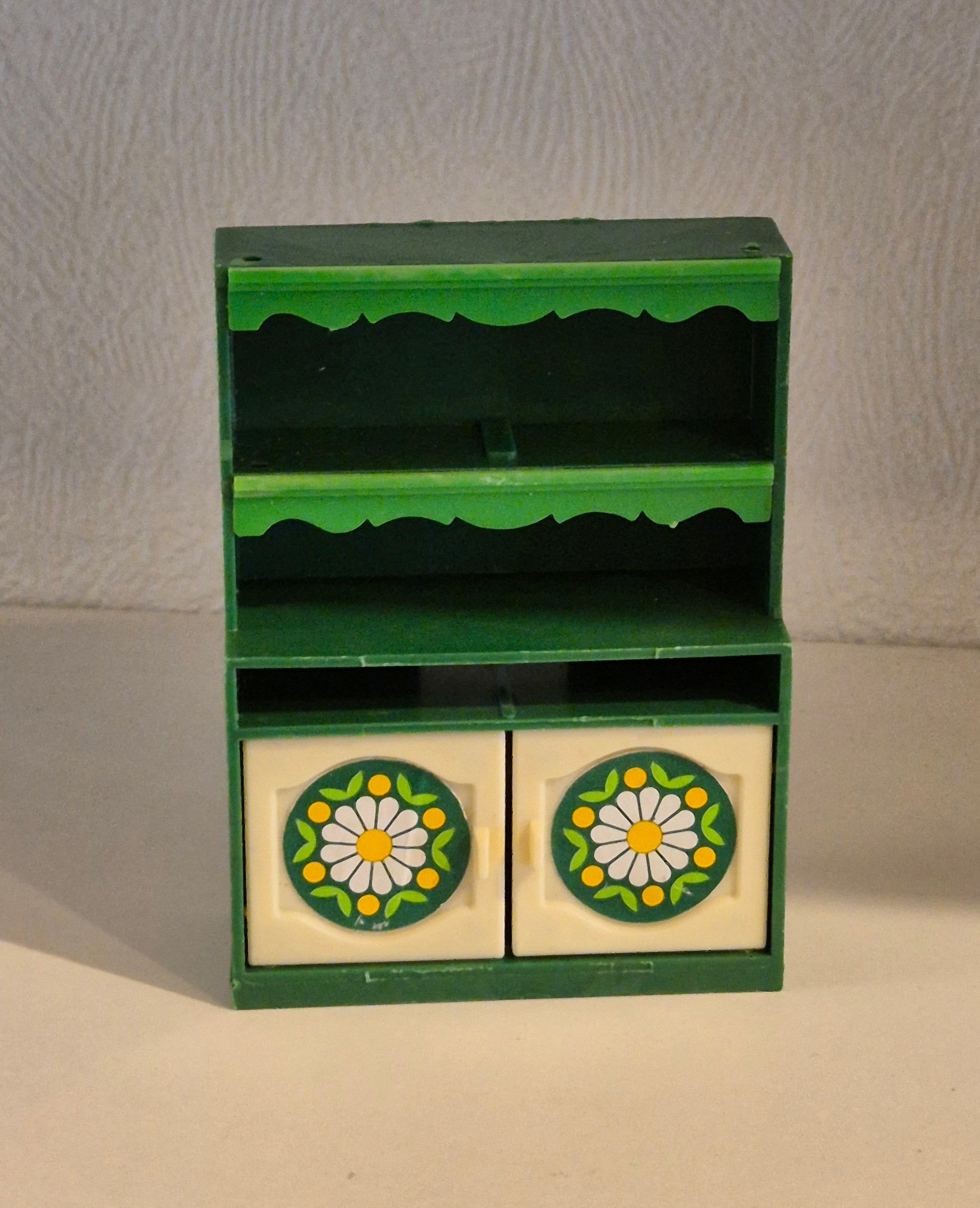 Pæn og sød reol i grøn med retro blomster-motiver. Det er af plast og af mærket Modella i str 1:18..