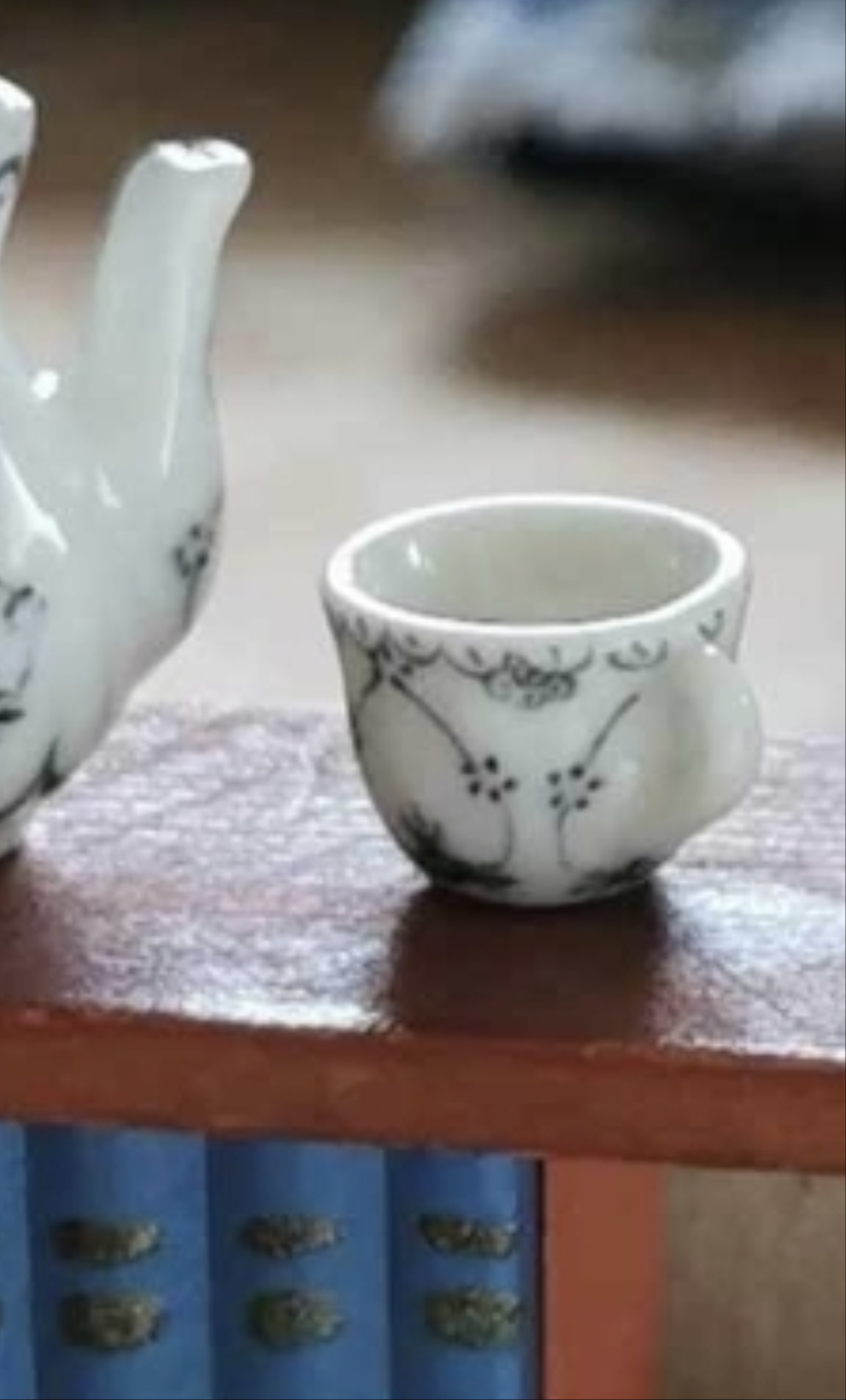 Smuk kaffekop i hvid porcelæn med sort musselmalet motiv og detaljer.