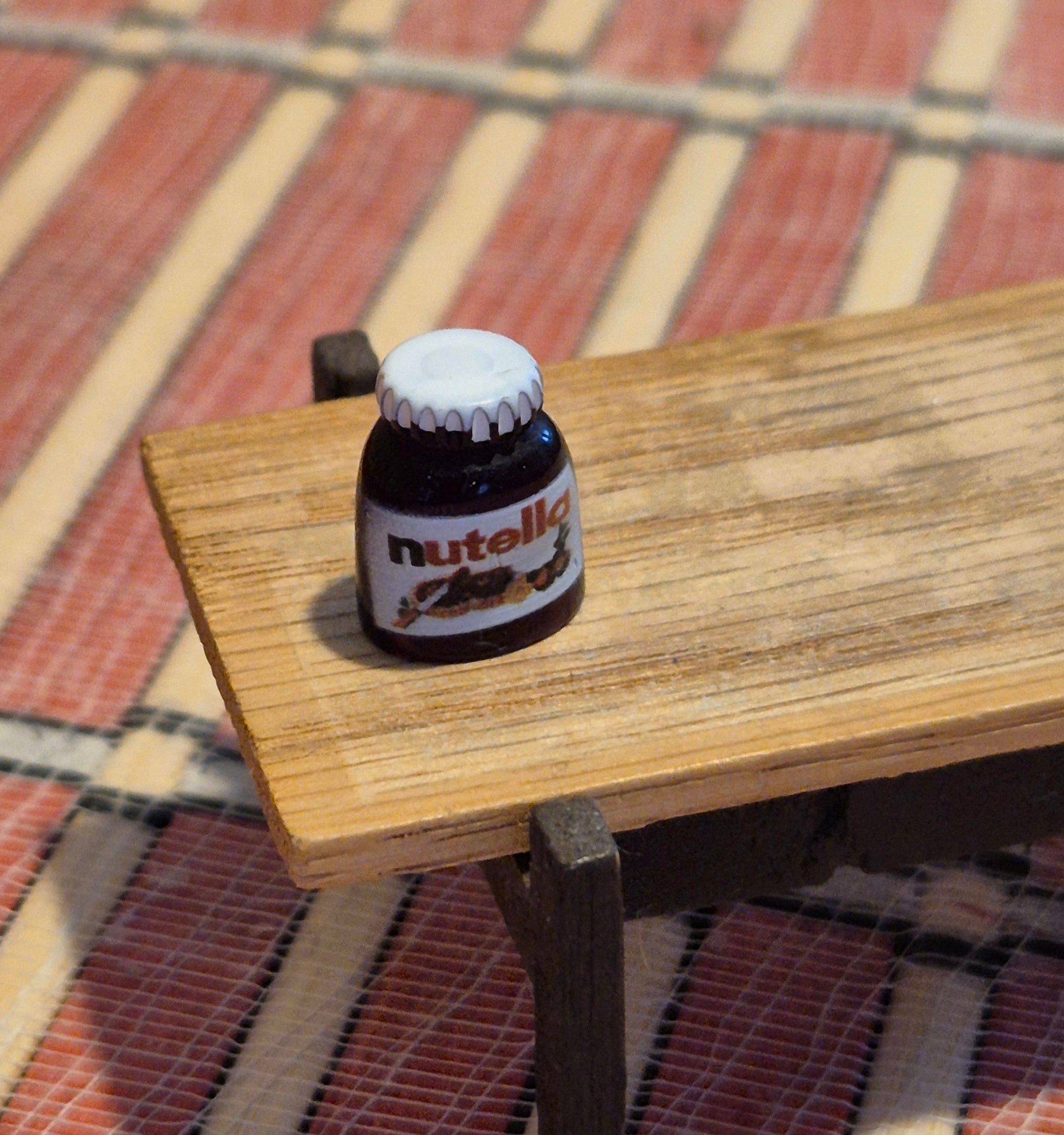 Fint Nutella glas til dukkehus. Pænt tilbehør til køkken, madlavning eller til bordet i nissehus til jul.