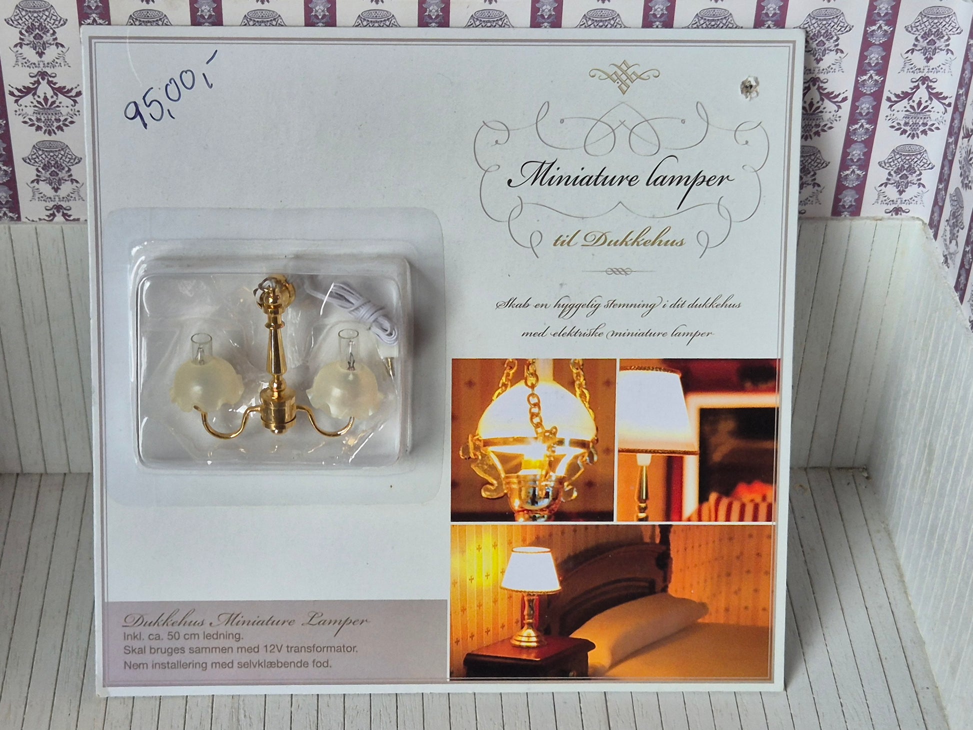 Pæn 1:12 lampe med 2 arme til dukkehuset. Den har form som petroleumslampe med såkaldte væge-rør og matteret glas skærme.