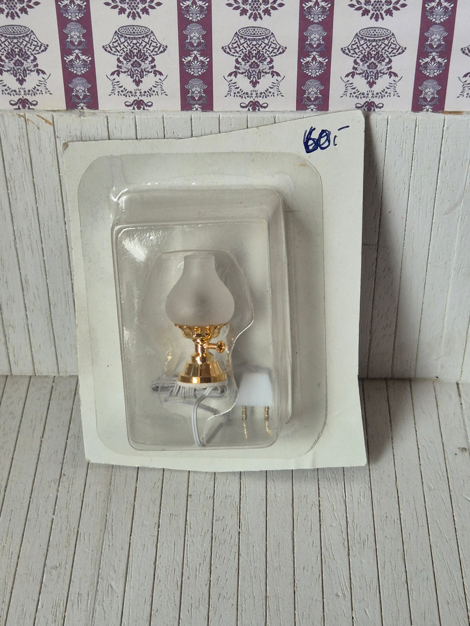 Pæn 1:12 lampe til dukkehuset. Den har form som petroleumslampe med matteret glas skærm.