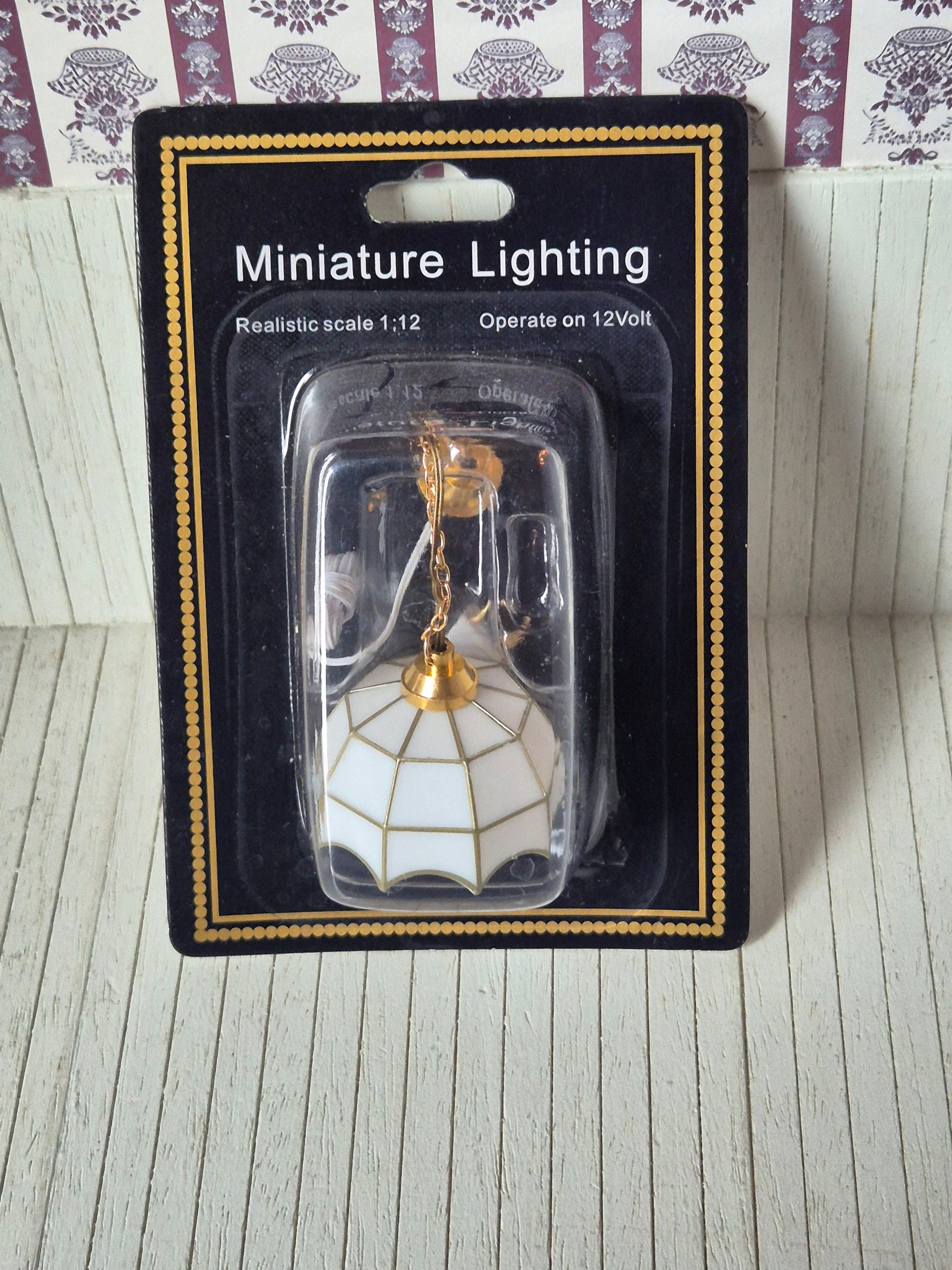 Pæn 1:12 lampe med fin plast skærm i Tiffany stil, hvid med guld striber og detaljer til dukkehuset.