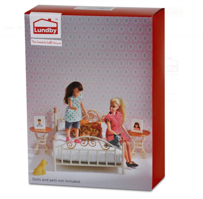 Fin Lundby dukkehus seng af "messing" med madras, sengelinned og 2 natborde.