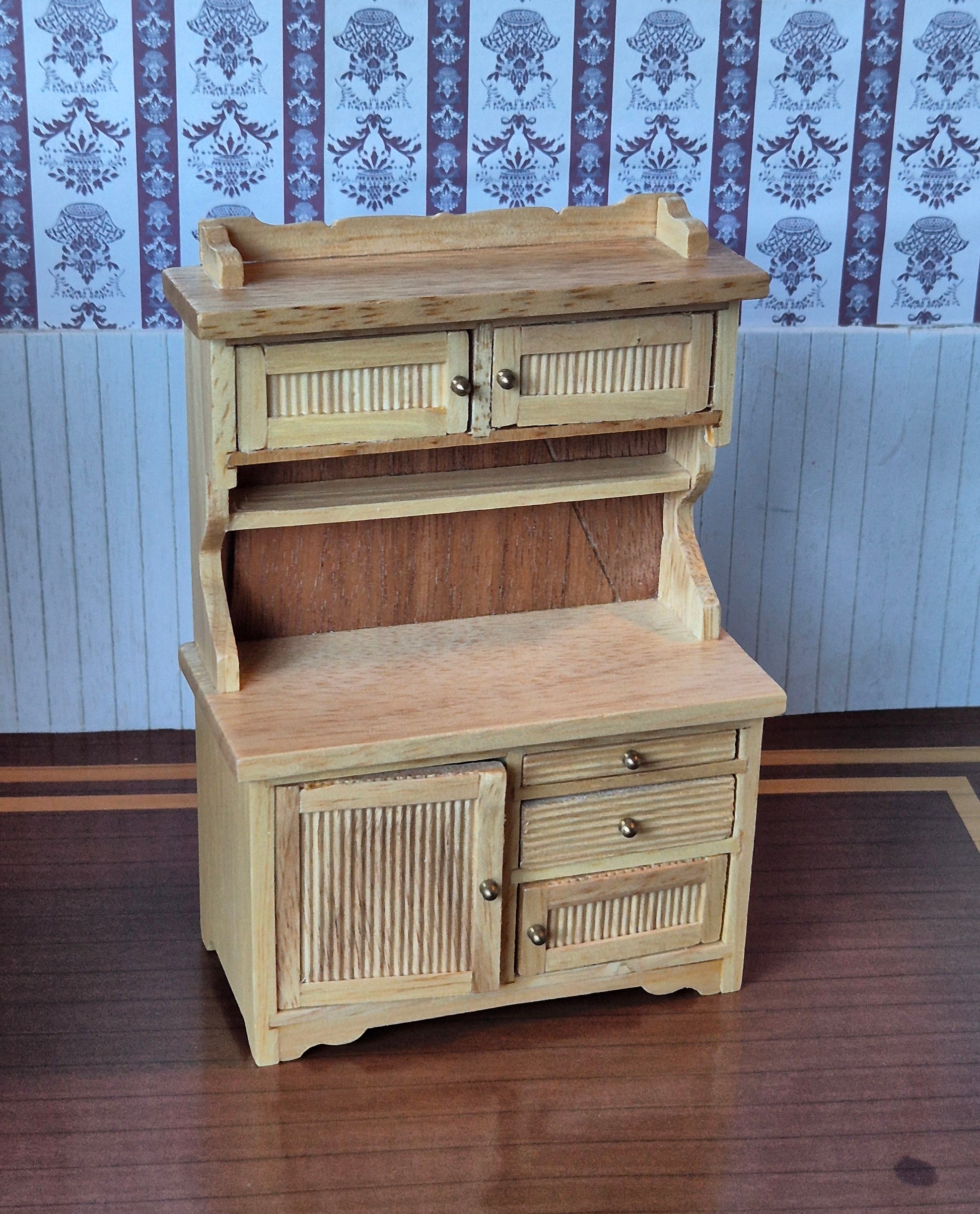 1:12 køkkenskab i træ med bordplade, skuffer, hylde og skabe.