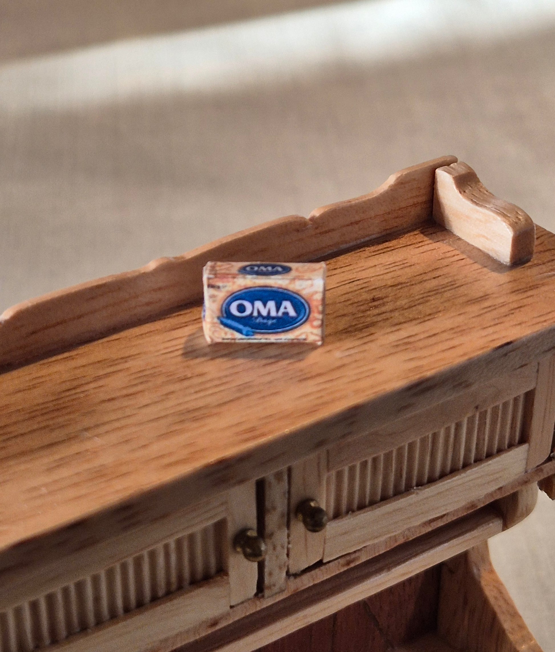 Pæn pakke OMA Stegemargarine til dukkehuset. Hjemmelavet af privat miniature person.