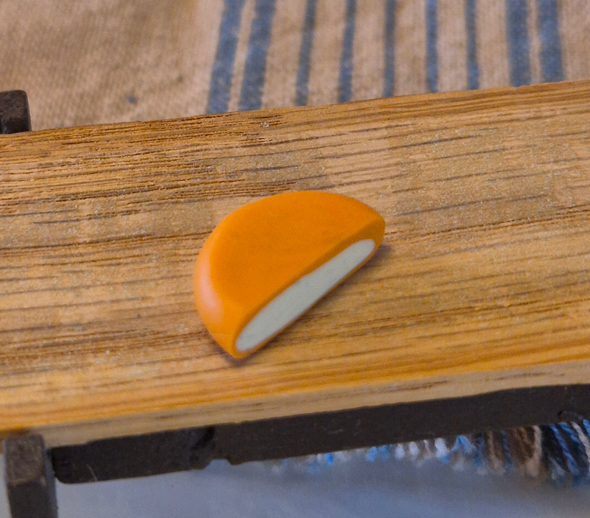 Halvt stykke ost til dukkehuset eller nissehus ved jul. Pænt stykke, gult.