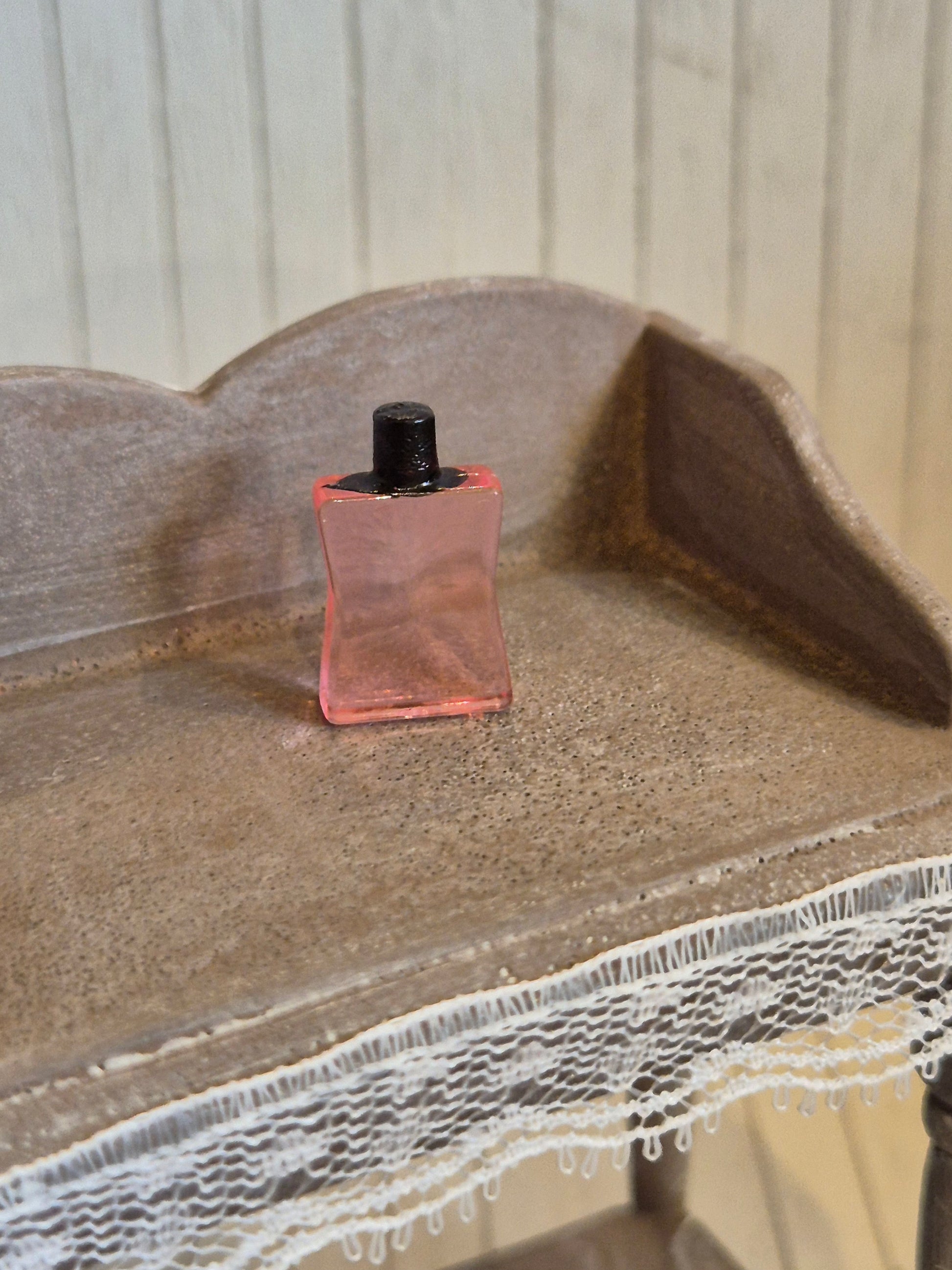Klar lyserød parfume, som tilbehør til dukkehus badeværelset. Ca 1 cm høj.