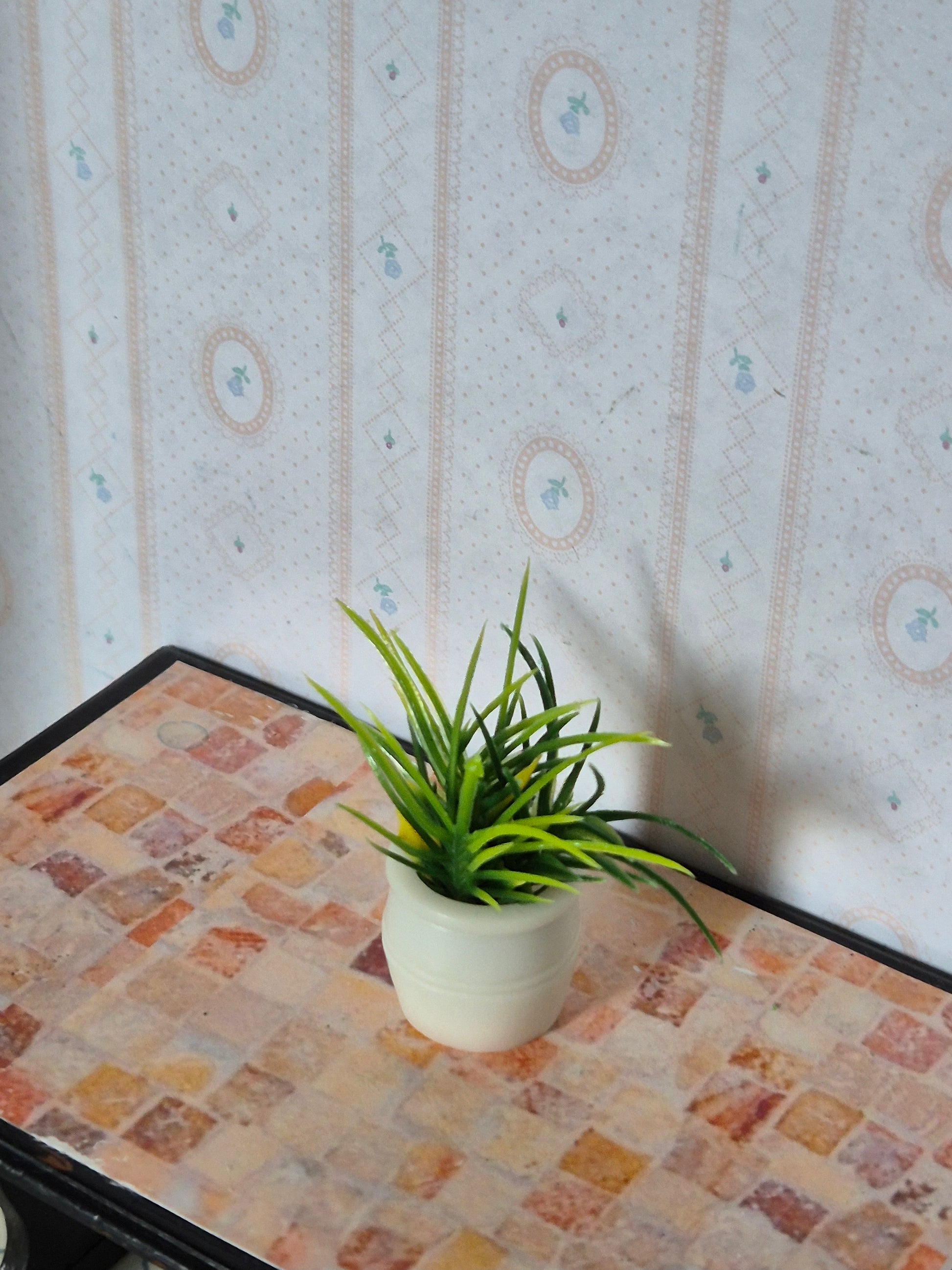Grøn plante i hvid potteskjuler. Den passer bedst til 1:12 eller som gulvplante til 1:16.