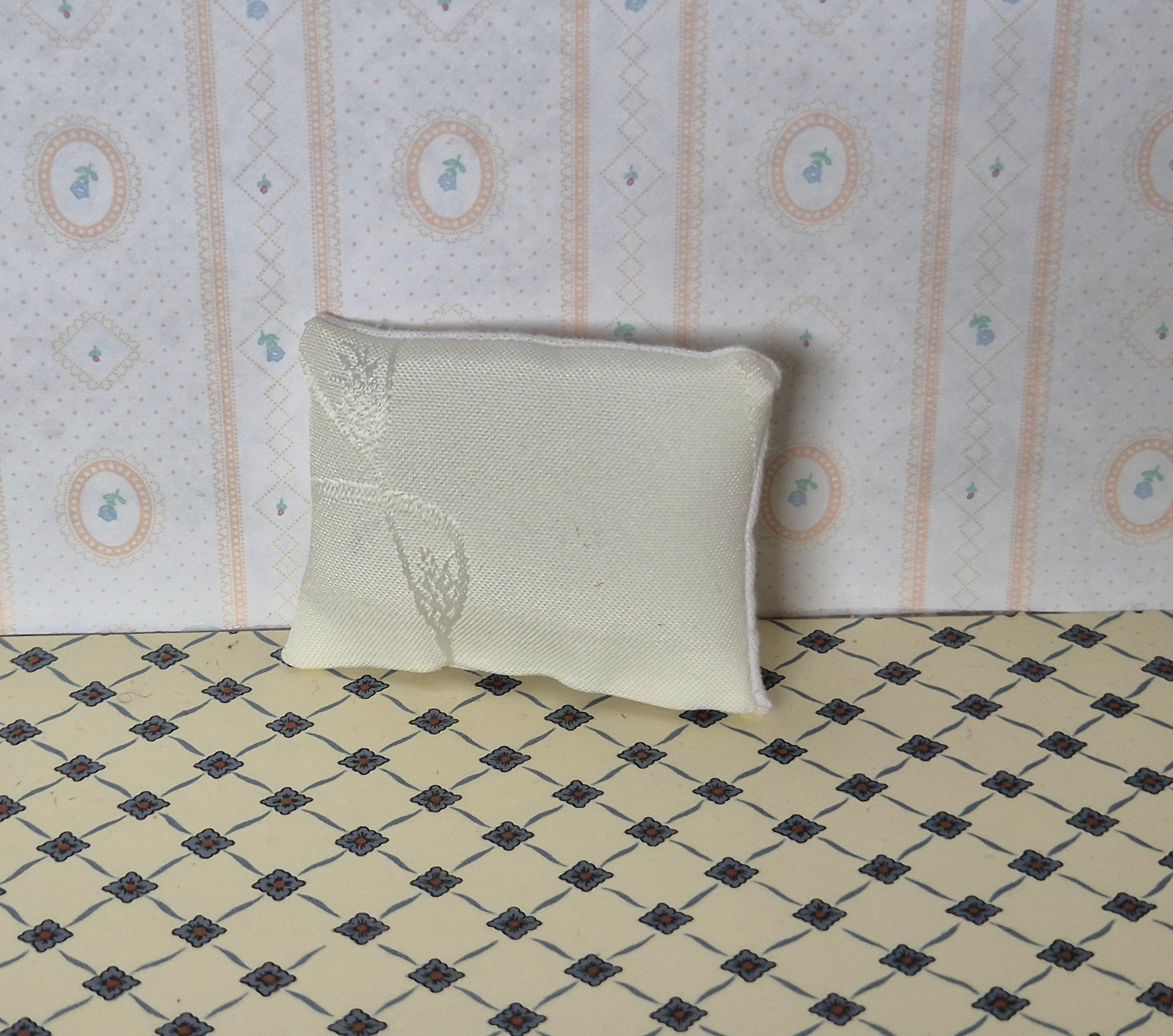 Hvid pude med svagt mønster. Den har hvid bagsiden.