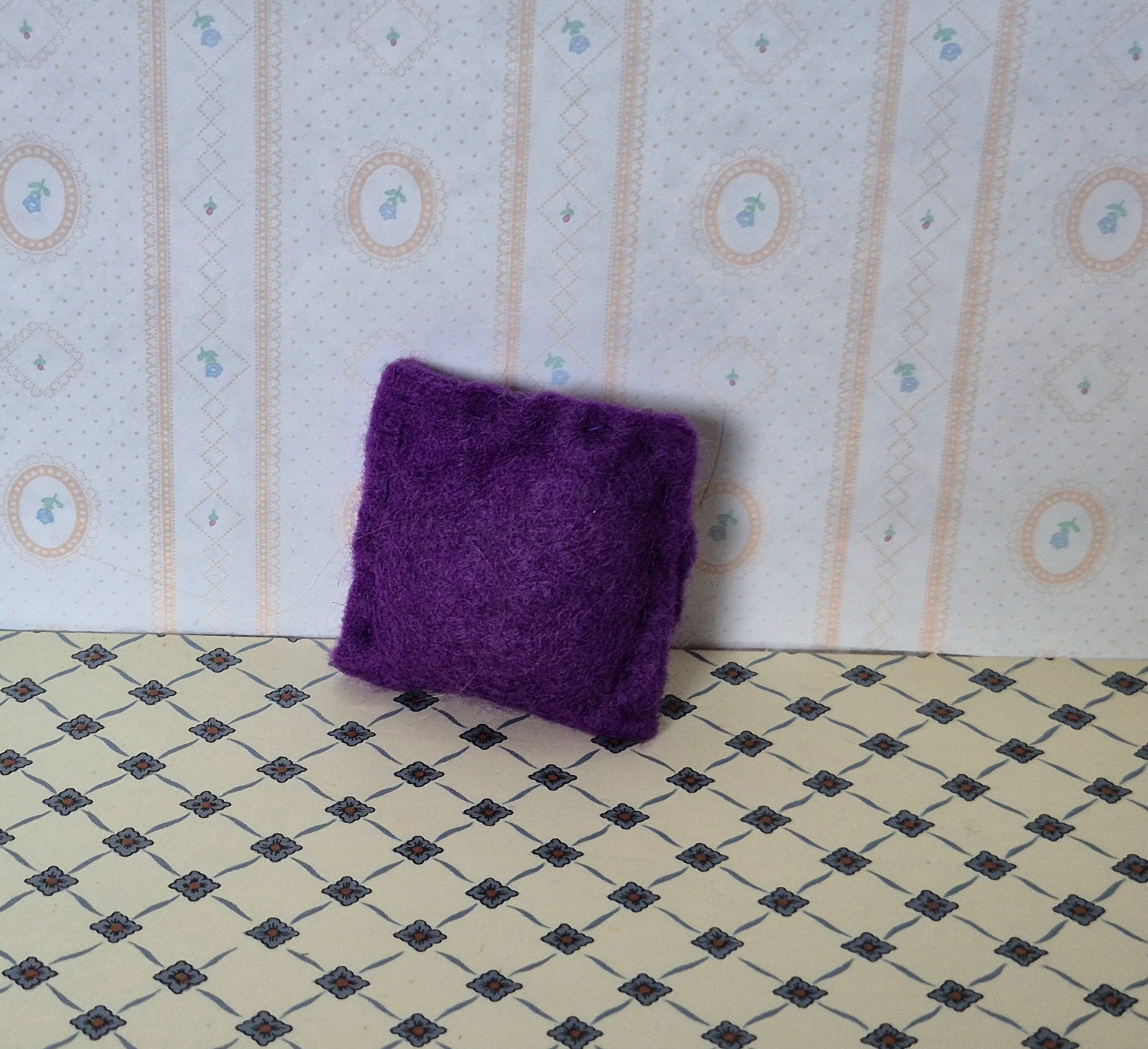 Pæn hjemmelavet filt pude, mørkelilla.