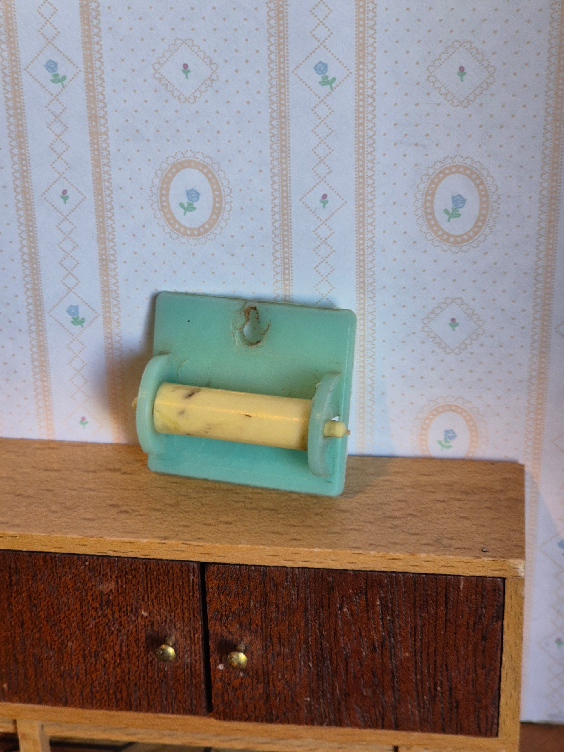 Pæn retro køkkenrulle holder i turkis gummi-plast-materiale. Passer til 1:16 - 1:12.