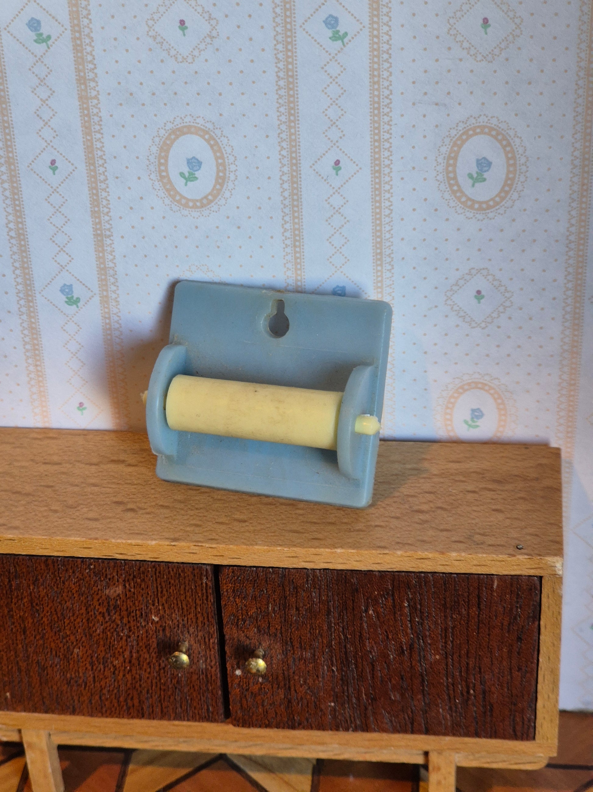 Pæn retro køkkenrulle holder i lyseblå gummi-plast-materiale. Passer til 1:16 - 1:12.