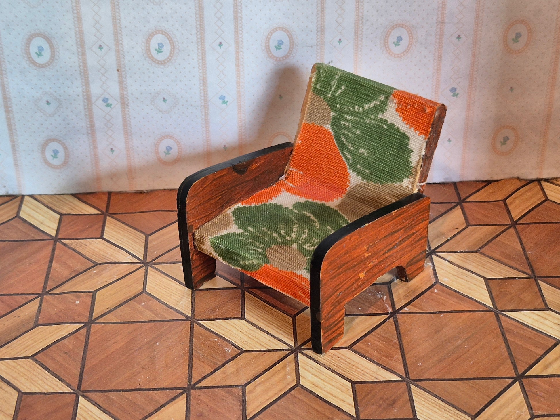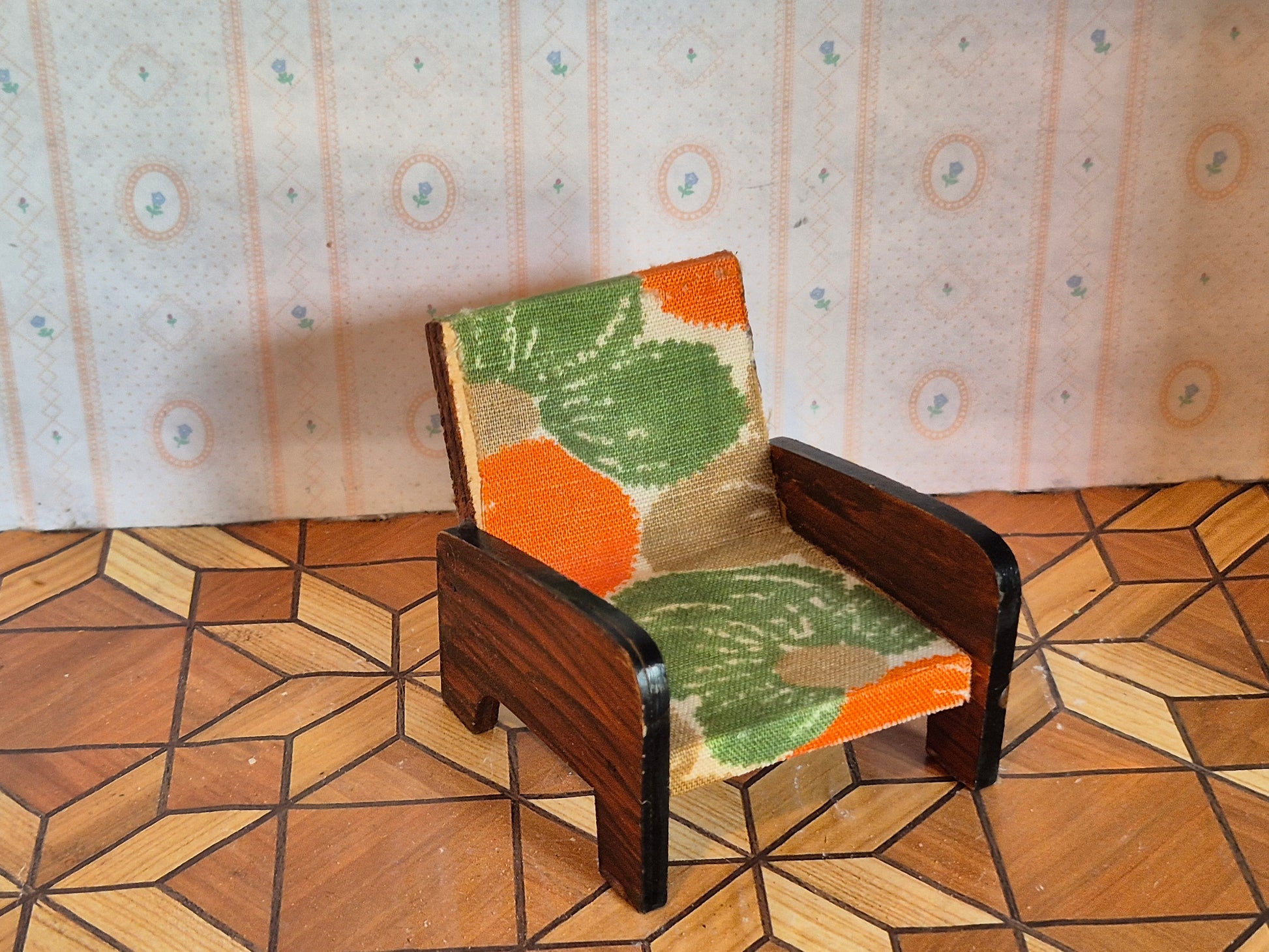 Retro lænestol i træ 1:16, dog i den store ende af skalaen. Udmærket stand