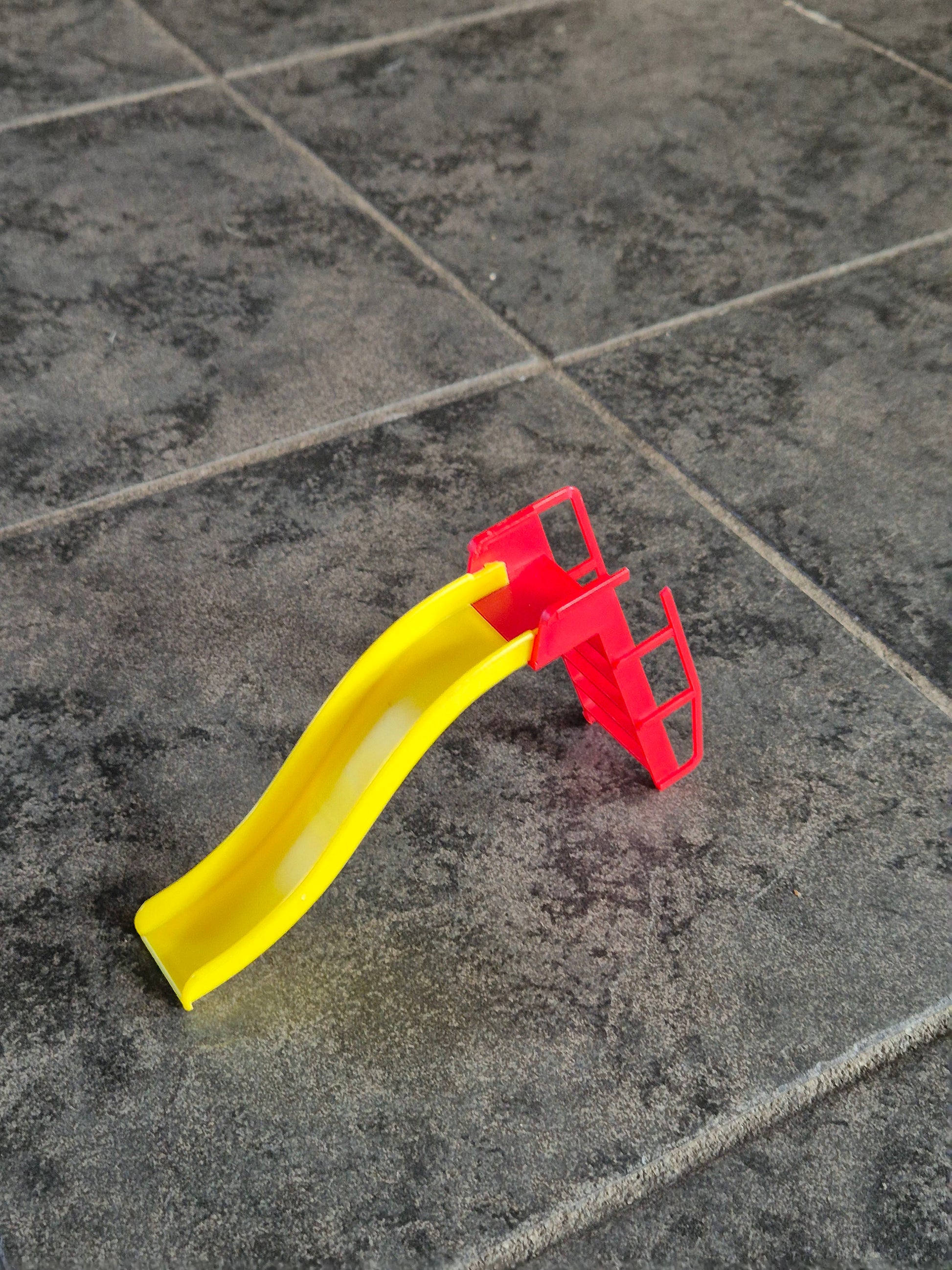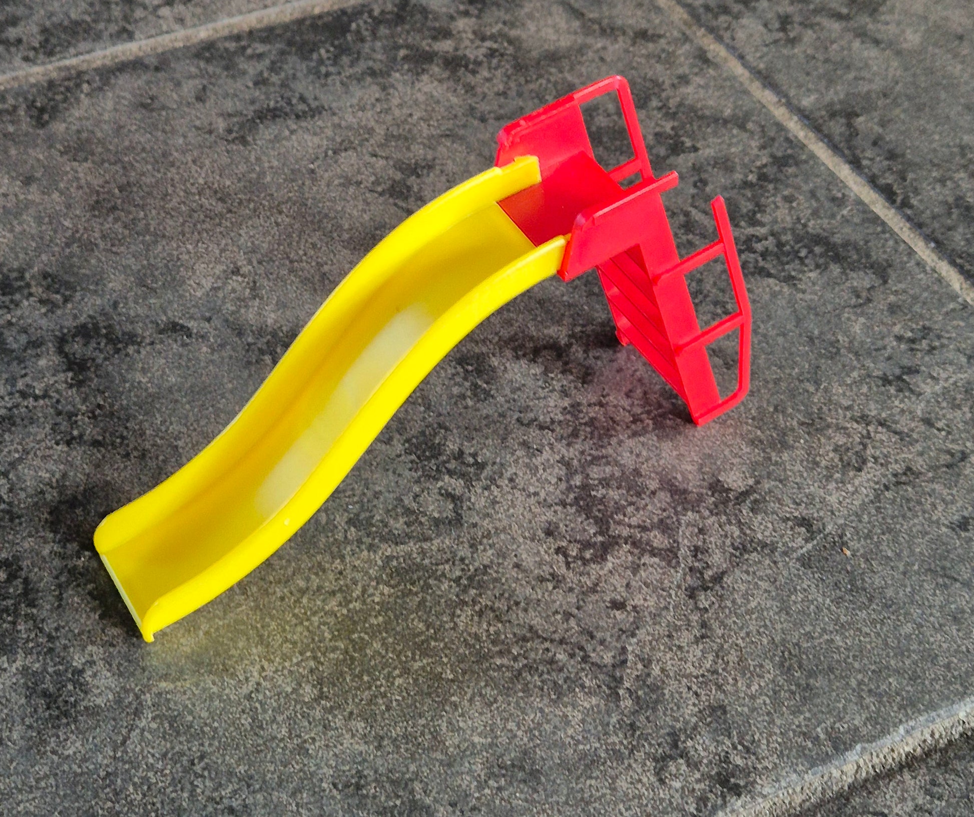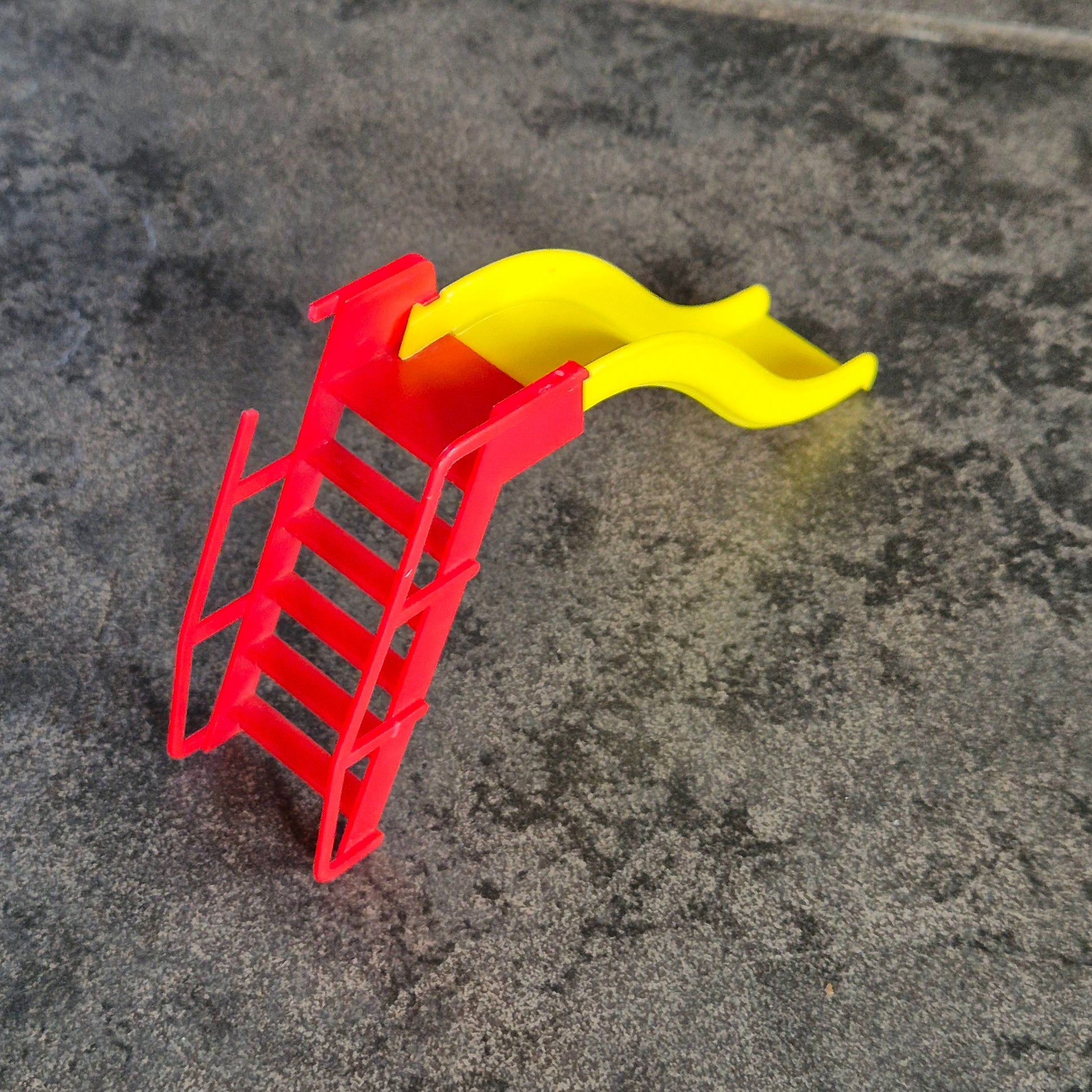 Rød og gul rutsjebane til dukkehusets have eller legeplads af Jean West Germany mærket, tysk. Ældre vintage/retro ting. Den er af plast.