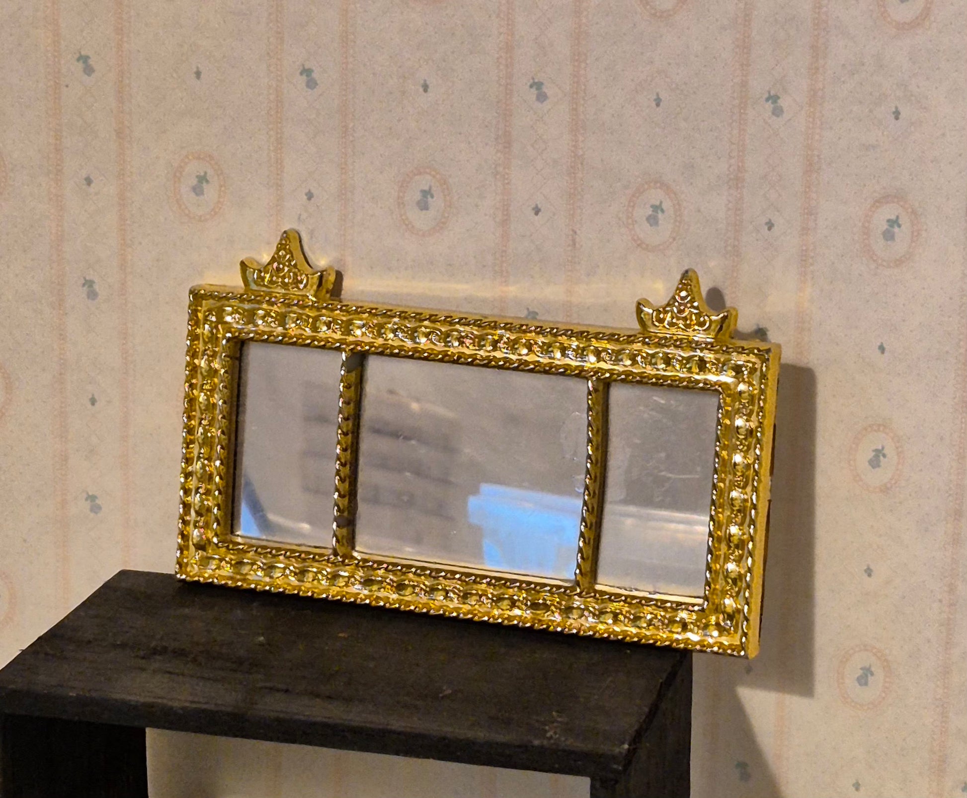 Kan bruges til de fleste dukkehus størrelser, da spejle kan fås i forskellige størrelser. Ca 9 centimeter bred.