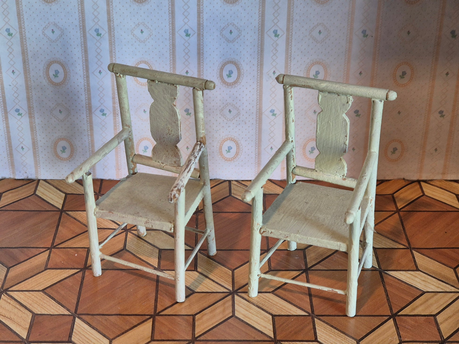Vintage sæt med 2 stole, hvidmalet træ. De er tynde og skrøbelige, som passer nok bedst til 1:14, men ok til 1:12