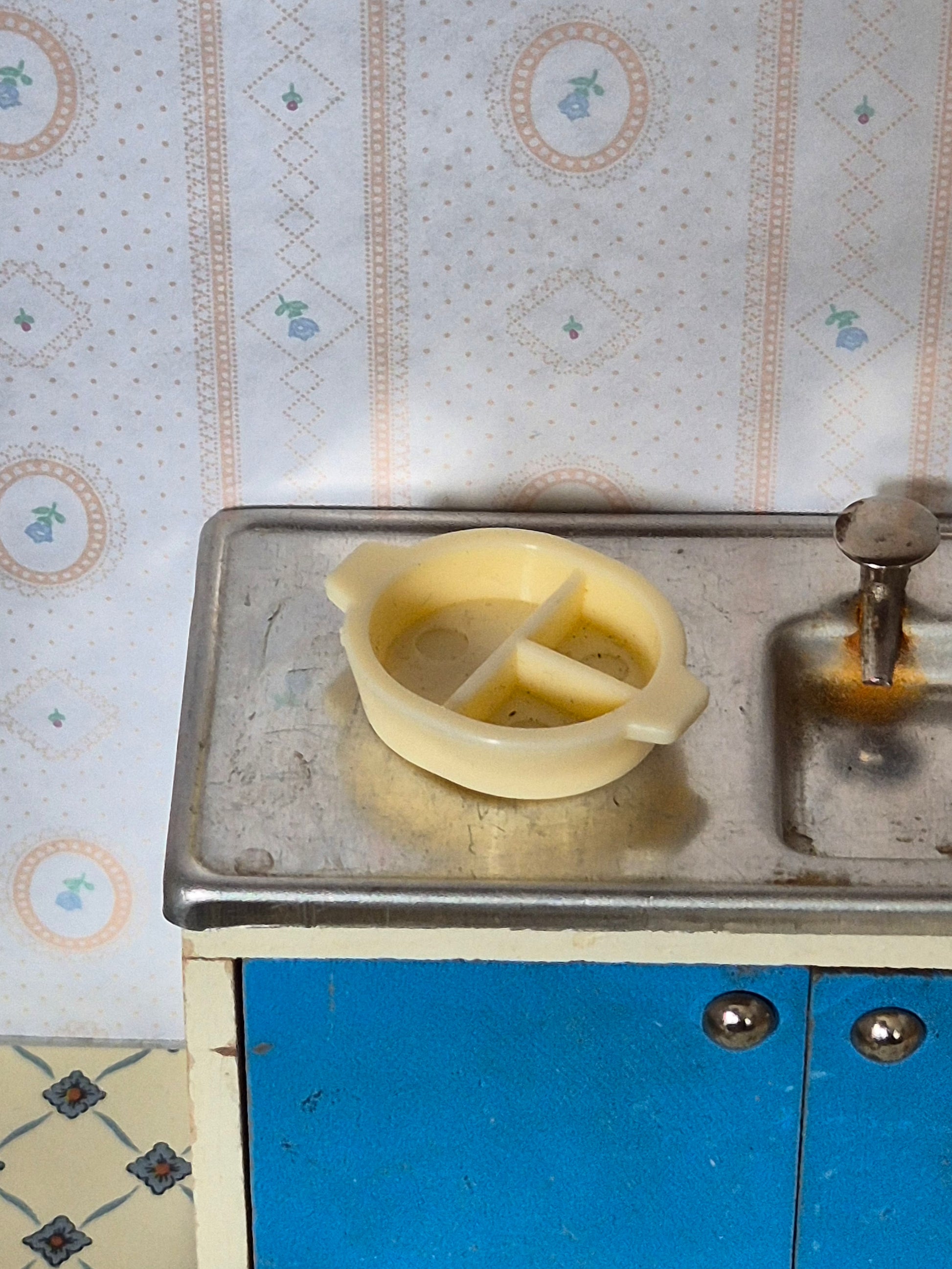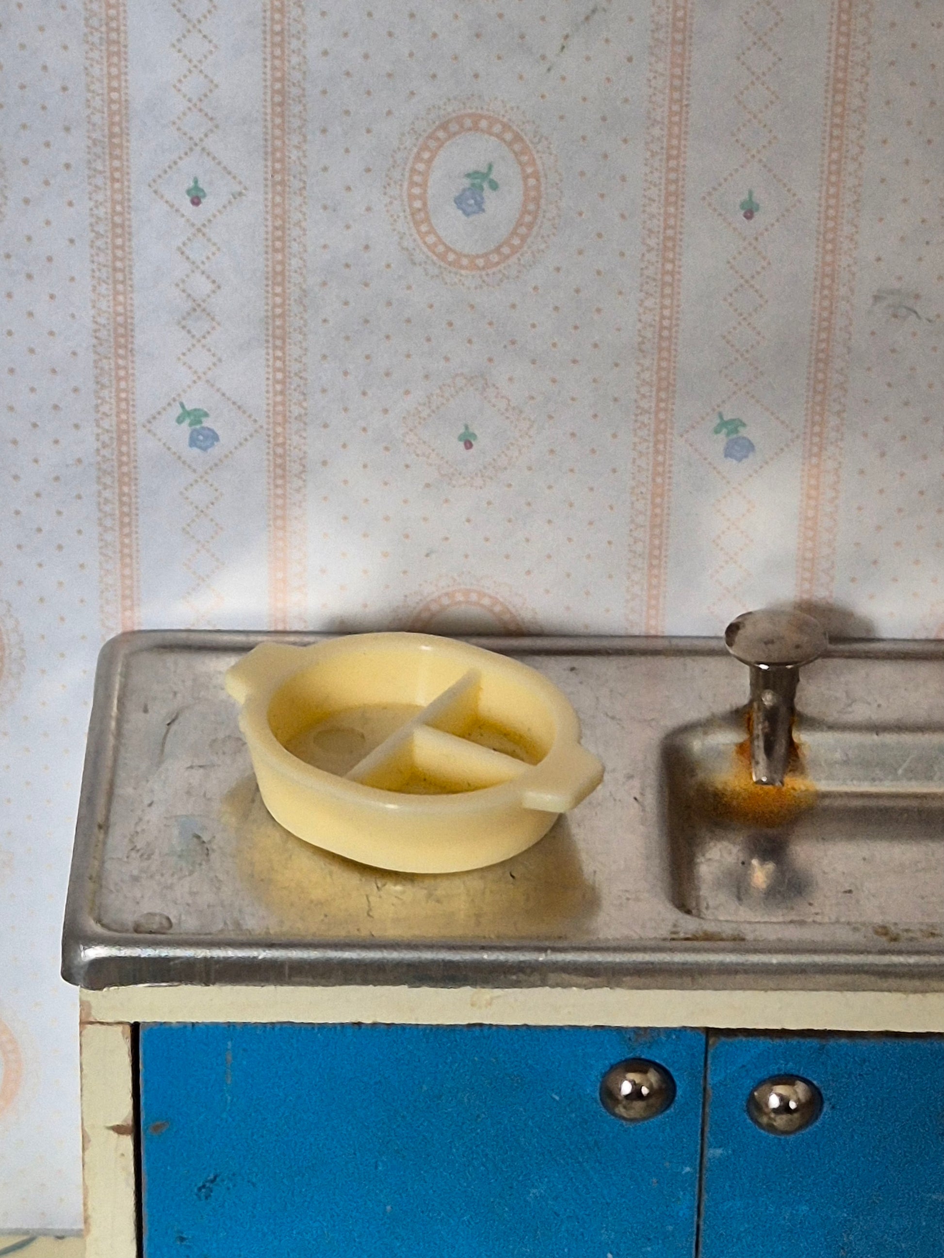 Inddelt tallerken til babymad. Den er af plast. Den passer bedst til 1:12.