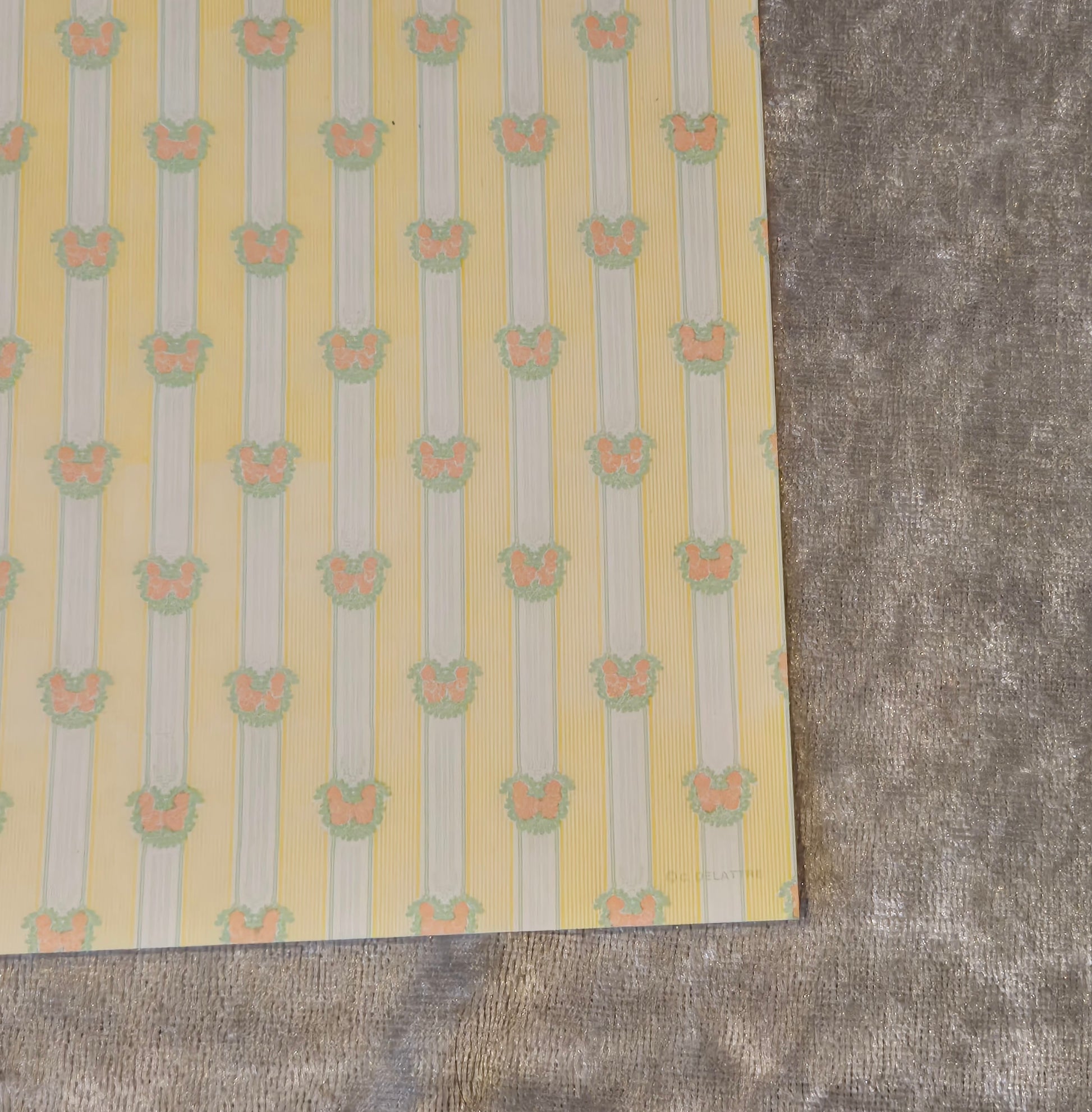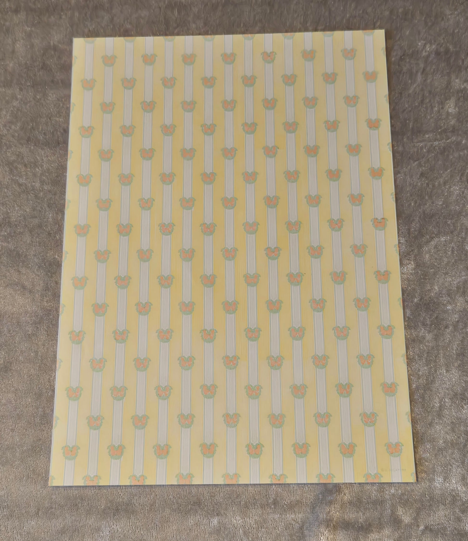 Ark tapet til dukkehuset, pænt gult med blålige striber og blomst motiv.