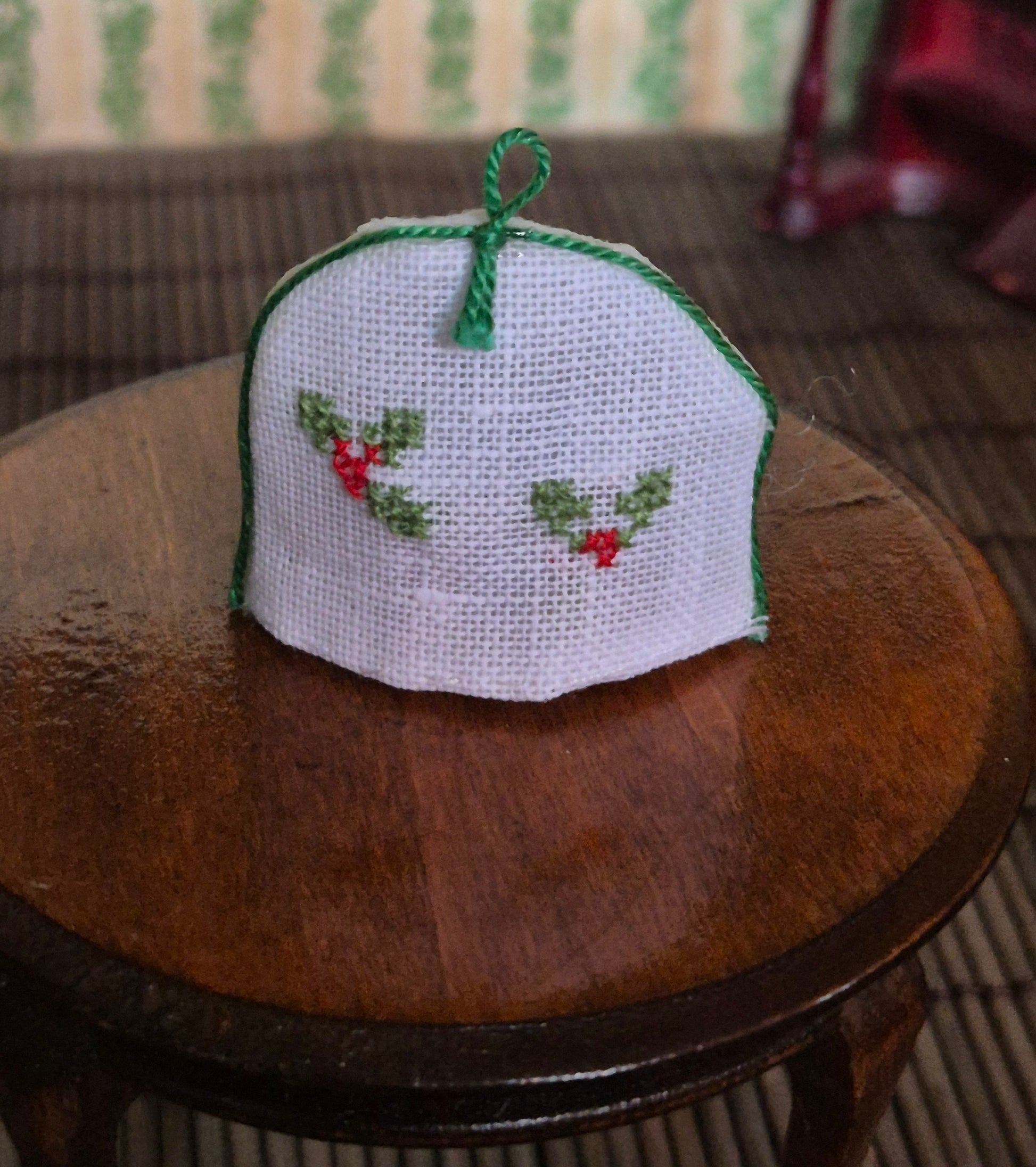 Fin tehætte med broderet mønster, kristtjørn. Den er lavet af privat kunstner / designer.