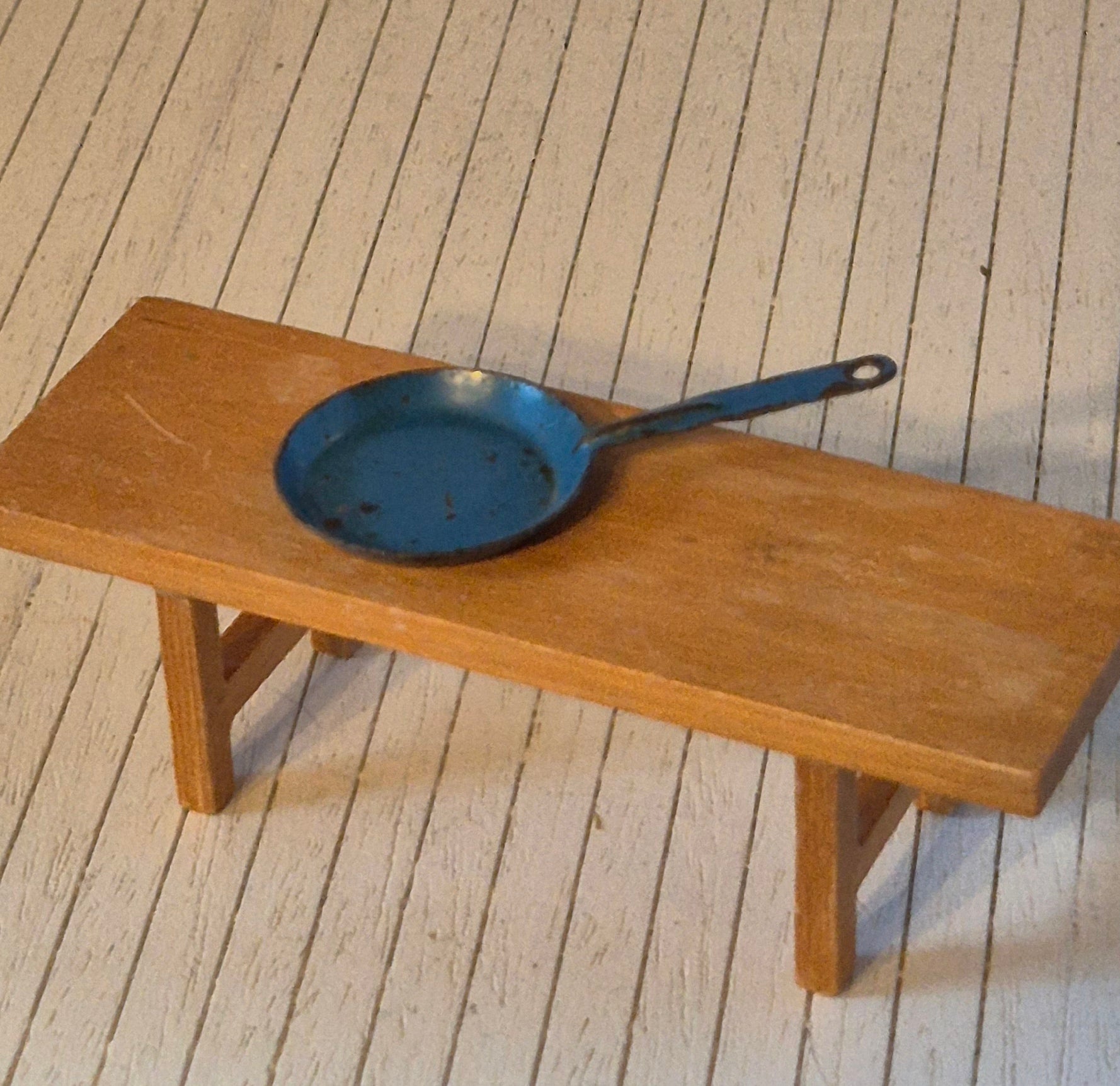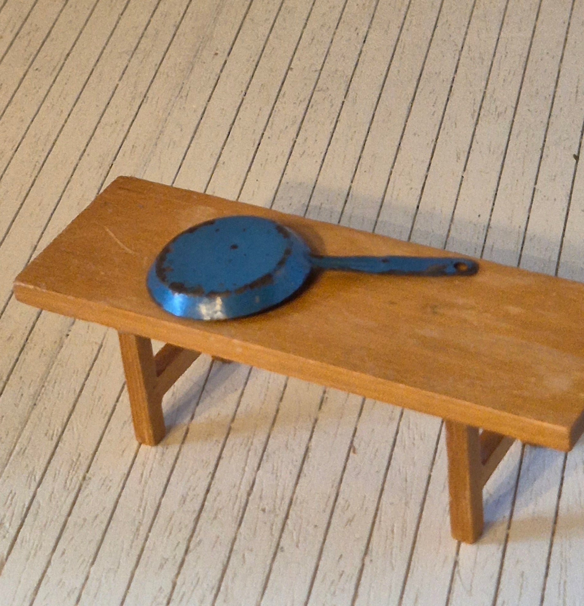 Blå metal stegepande af det danske kvalitetsdesign og mærke Tekno. Retro / ældre stegepande, tilbehør til dukkehus køkkenet.
