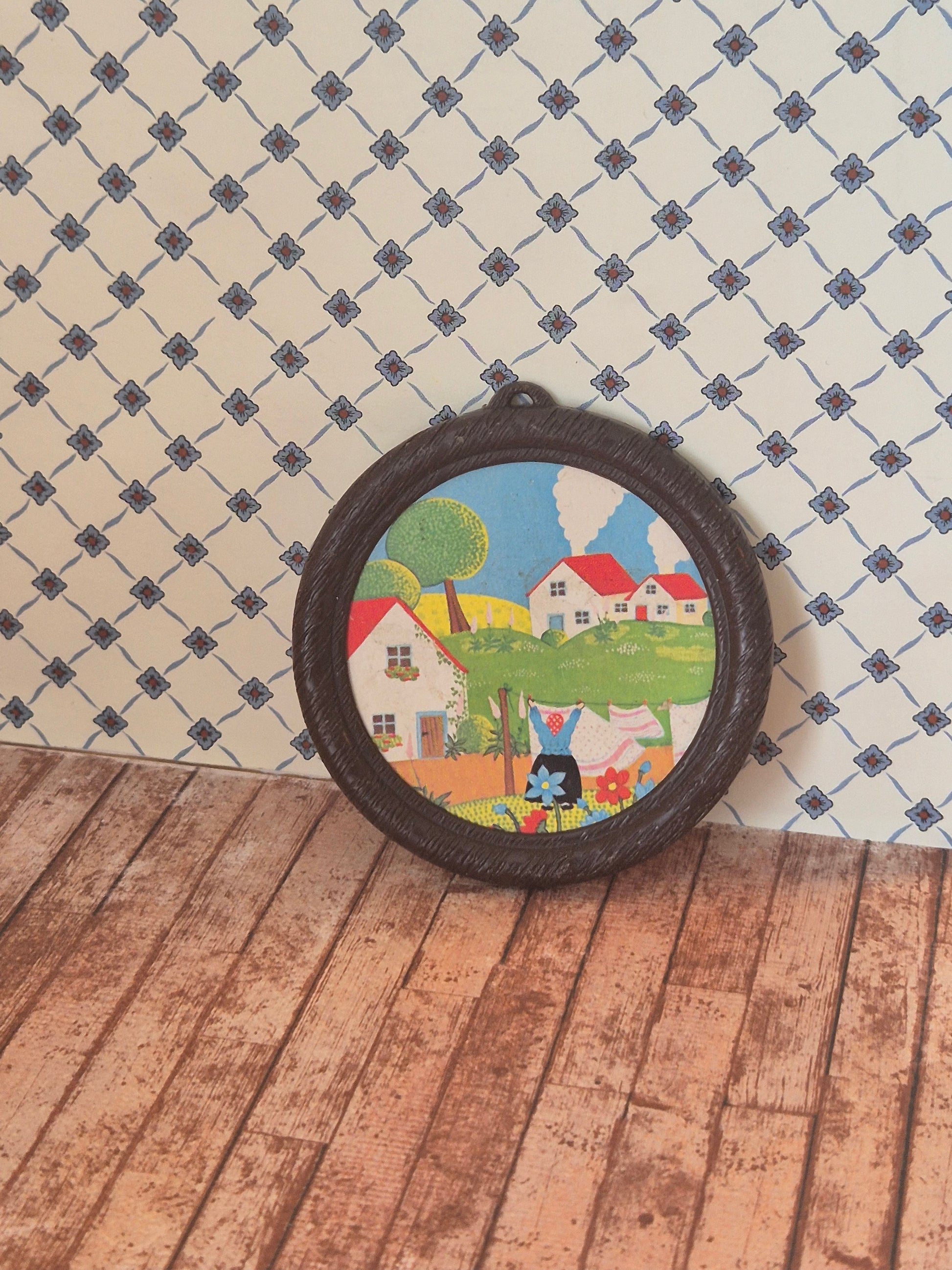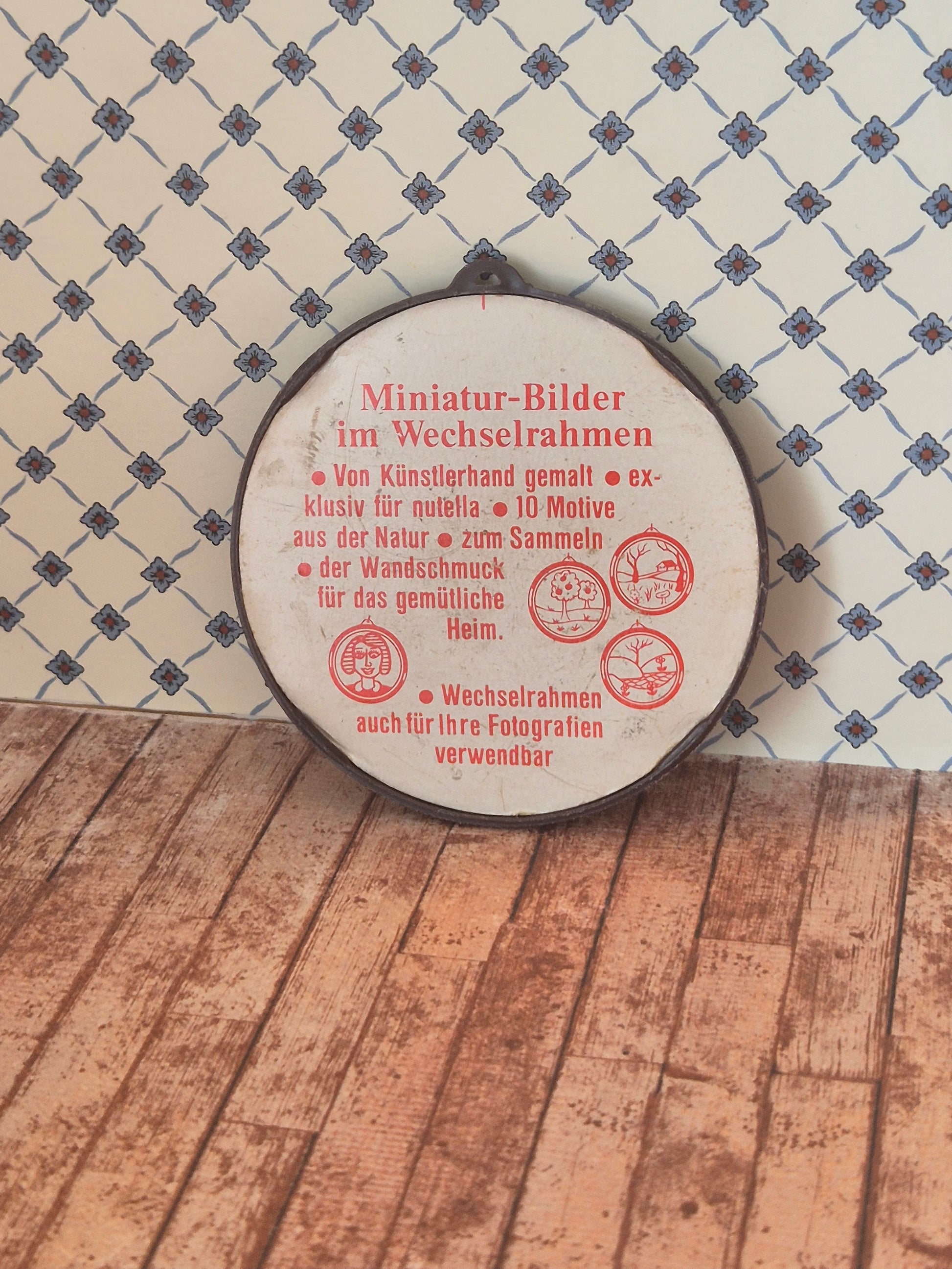 Udmærket rundt vintage billede, tysk design, der er ca 7 cm fra top. Det har en tynd brun plastik ramme. Standen er udmærket dog må patina og brugsspor forventes.