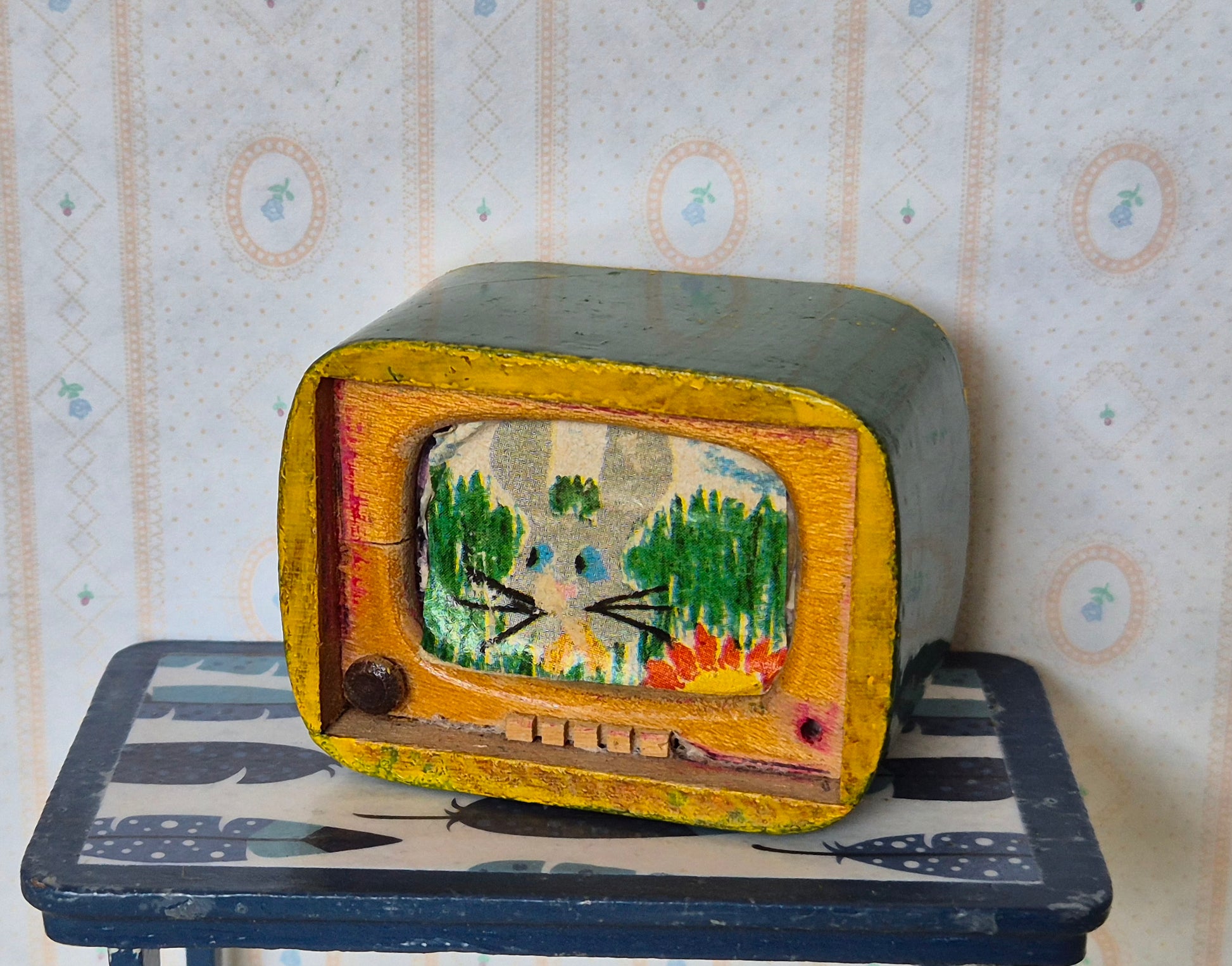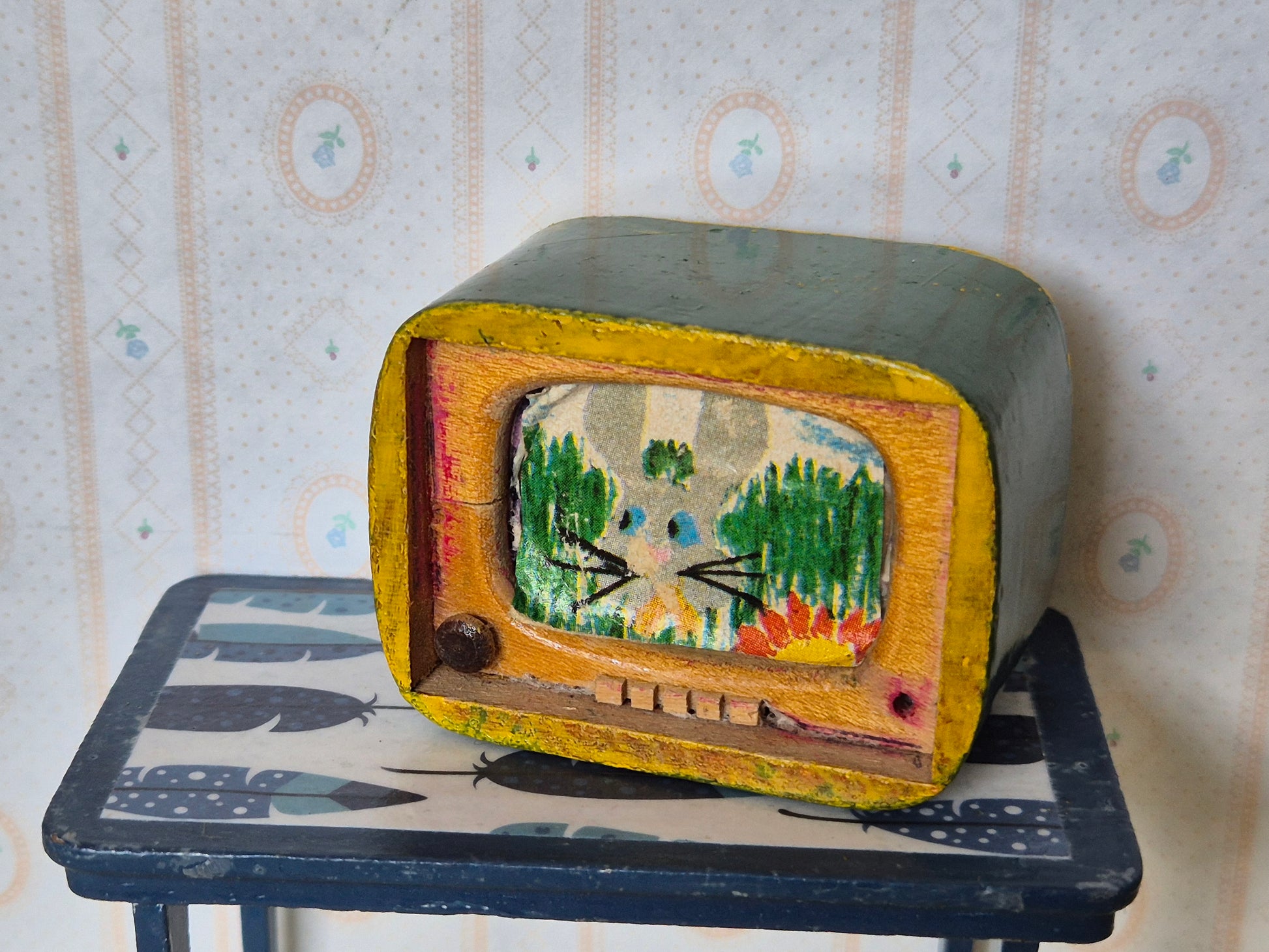 Vintage TV der er blevet malet og fået ny skærm. Ikke så pæn længere. Brugt med slidmærker.