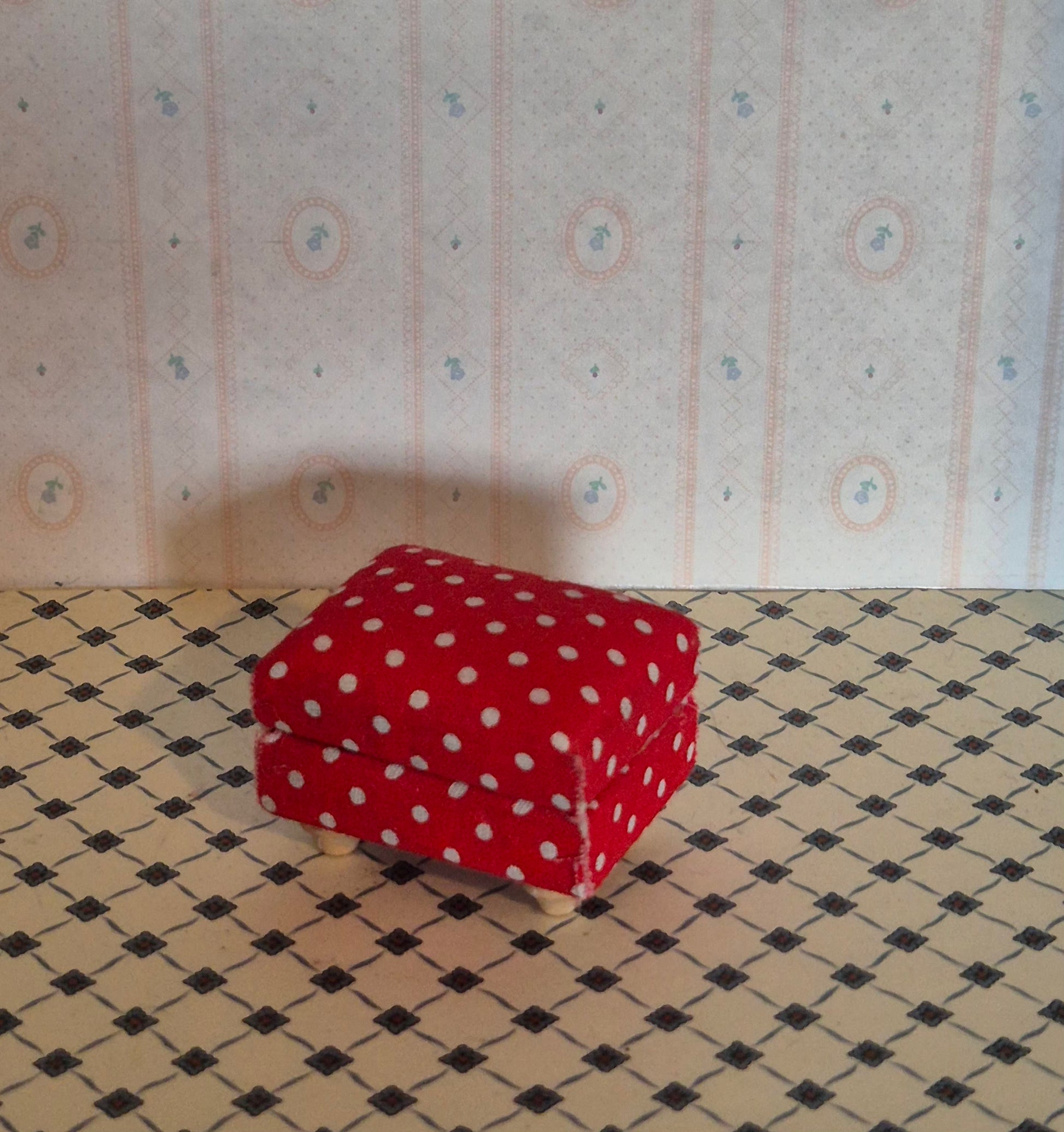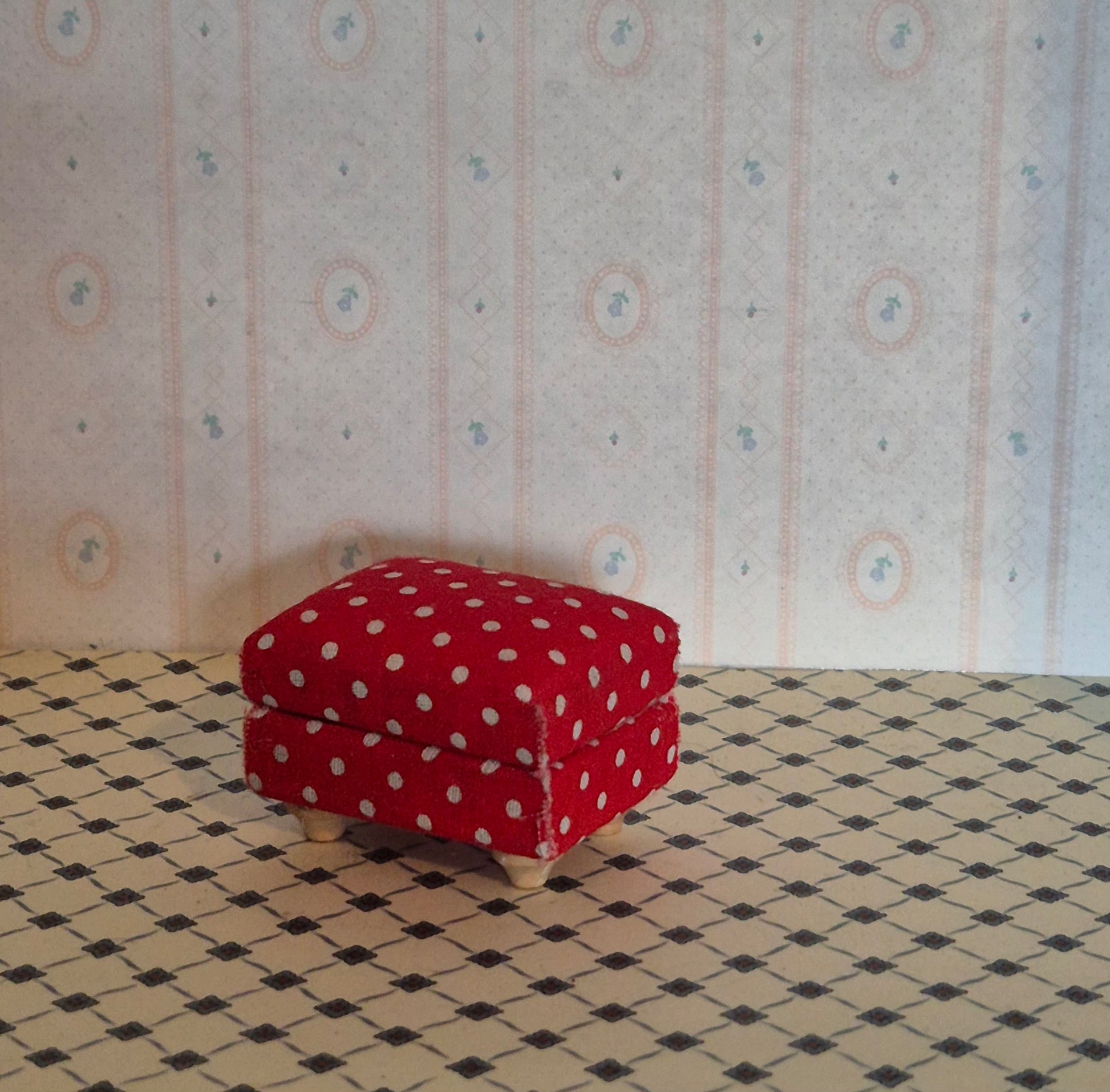 Pæn 1:12 fodskammel i rød med hvide prikker. Udmærket god.