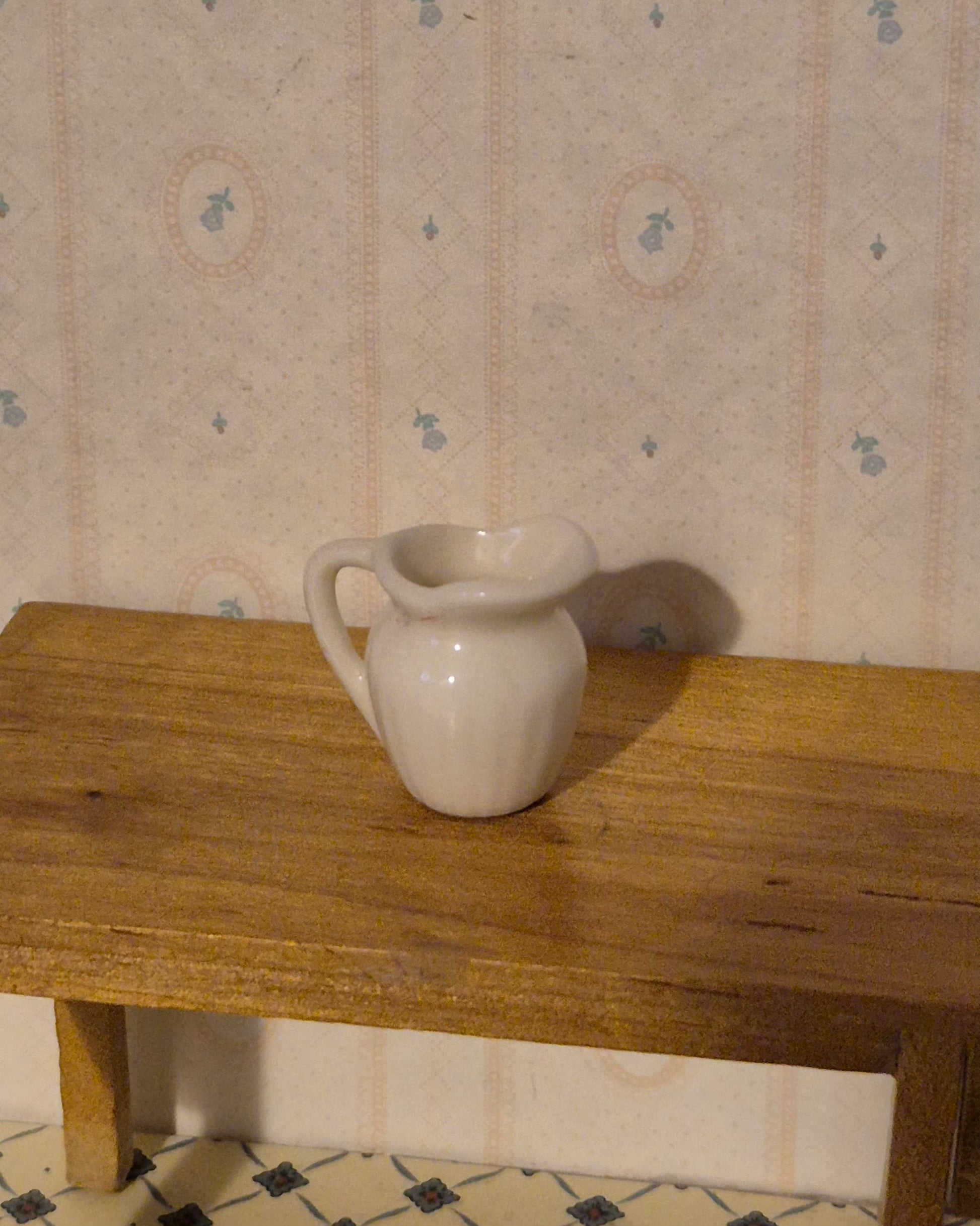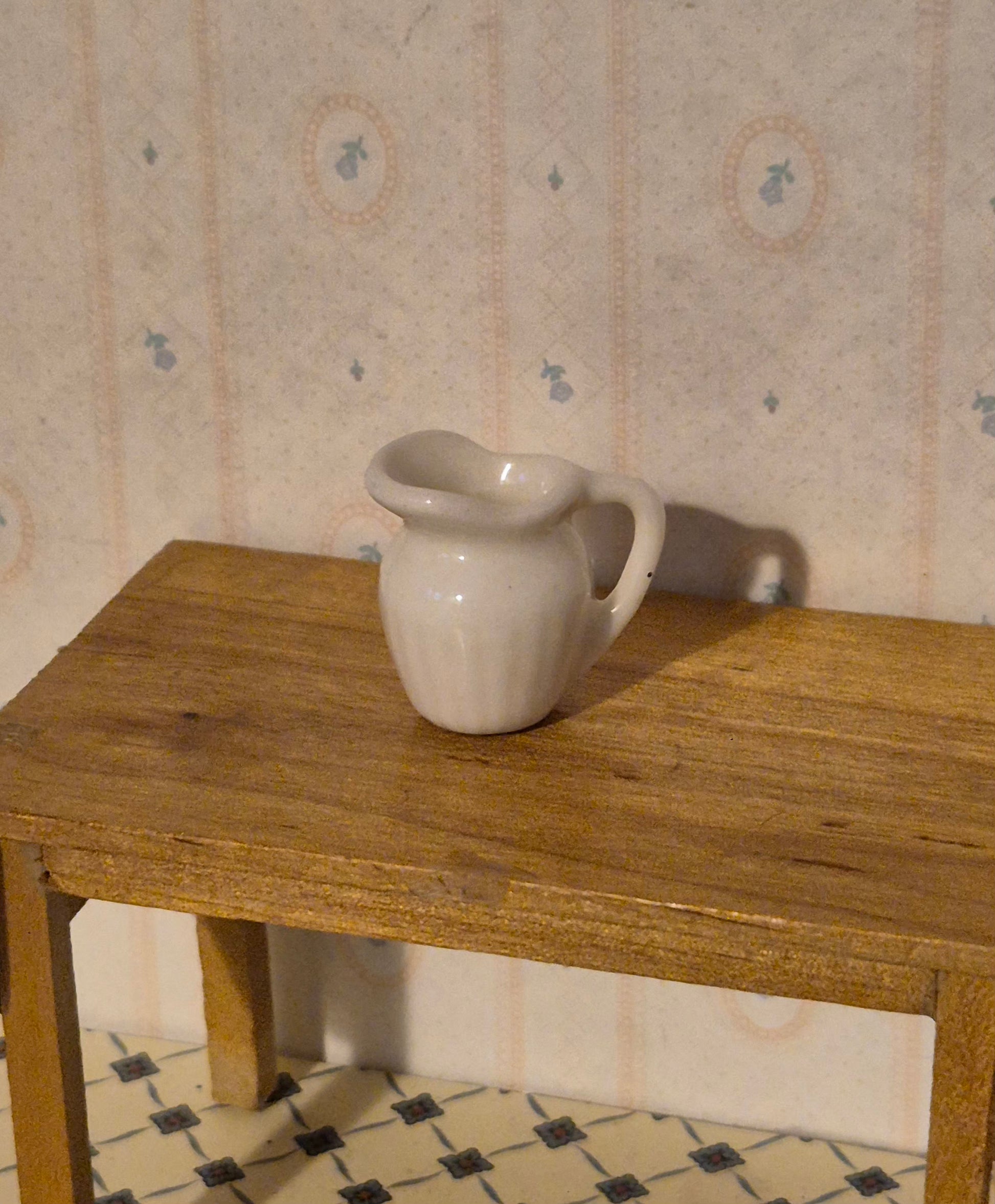 Pæn hvid porcelæn kande med riller, pæne detaljer. God stand. Str 1:12.