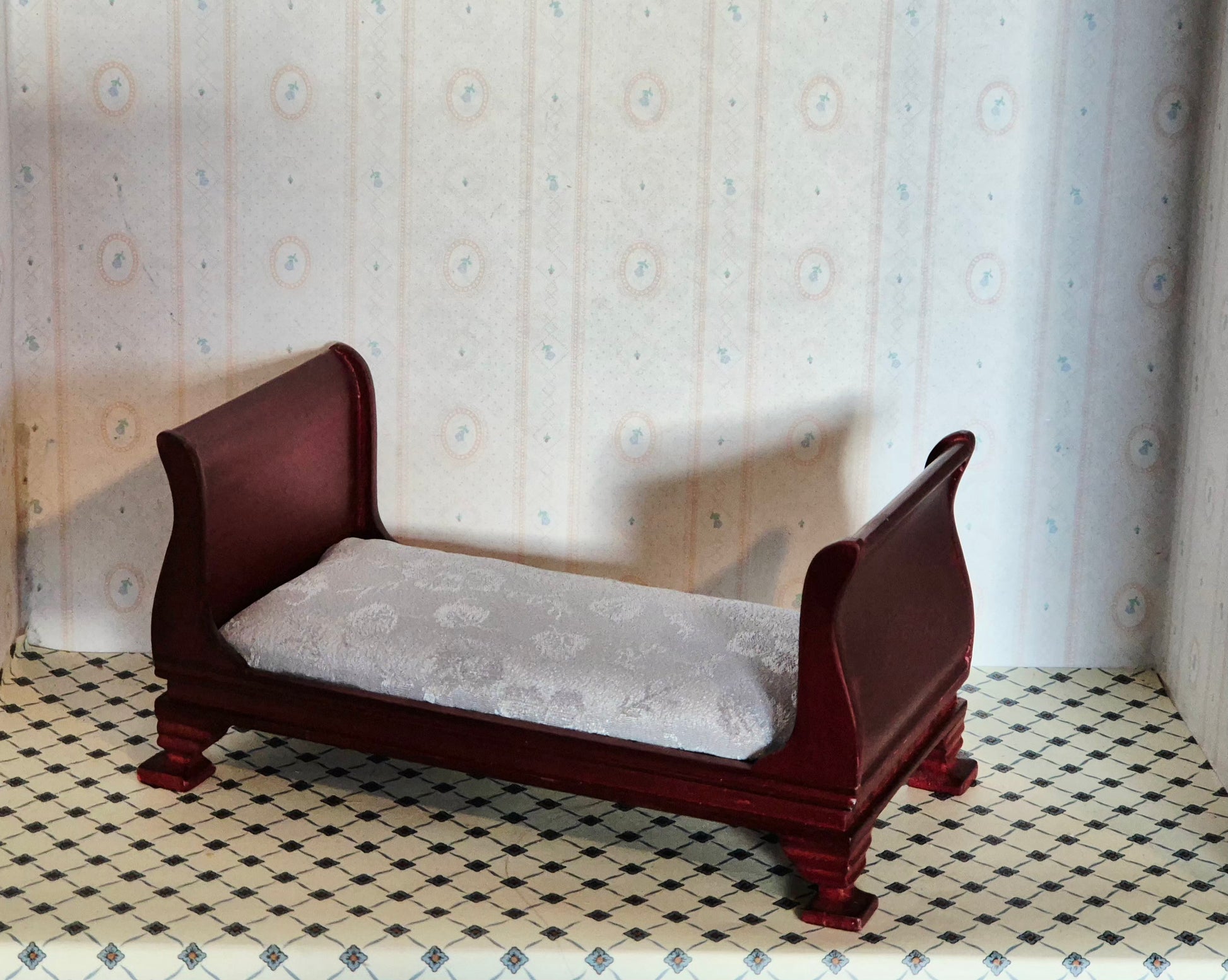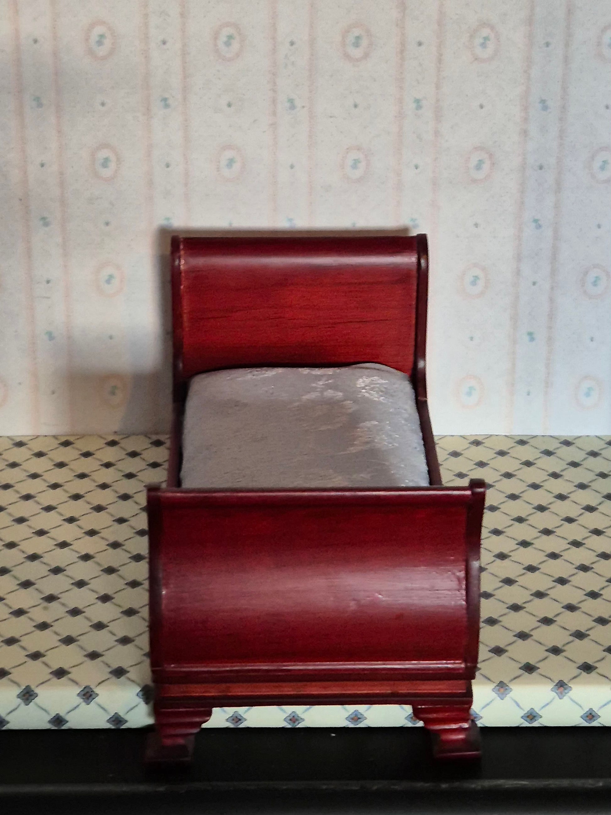 Rigtig pæn og god 1:12 enkeltseng. Der er lidt patina og spor af brug. Udmærket stand.