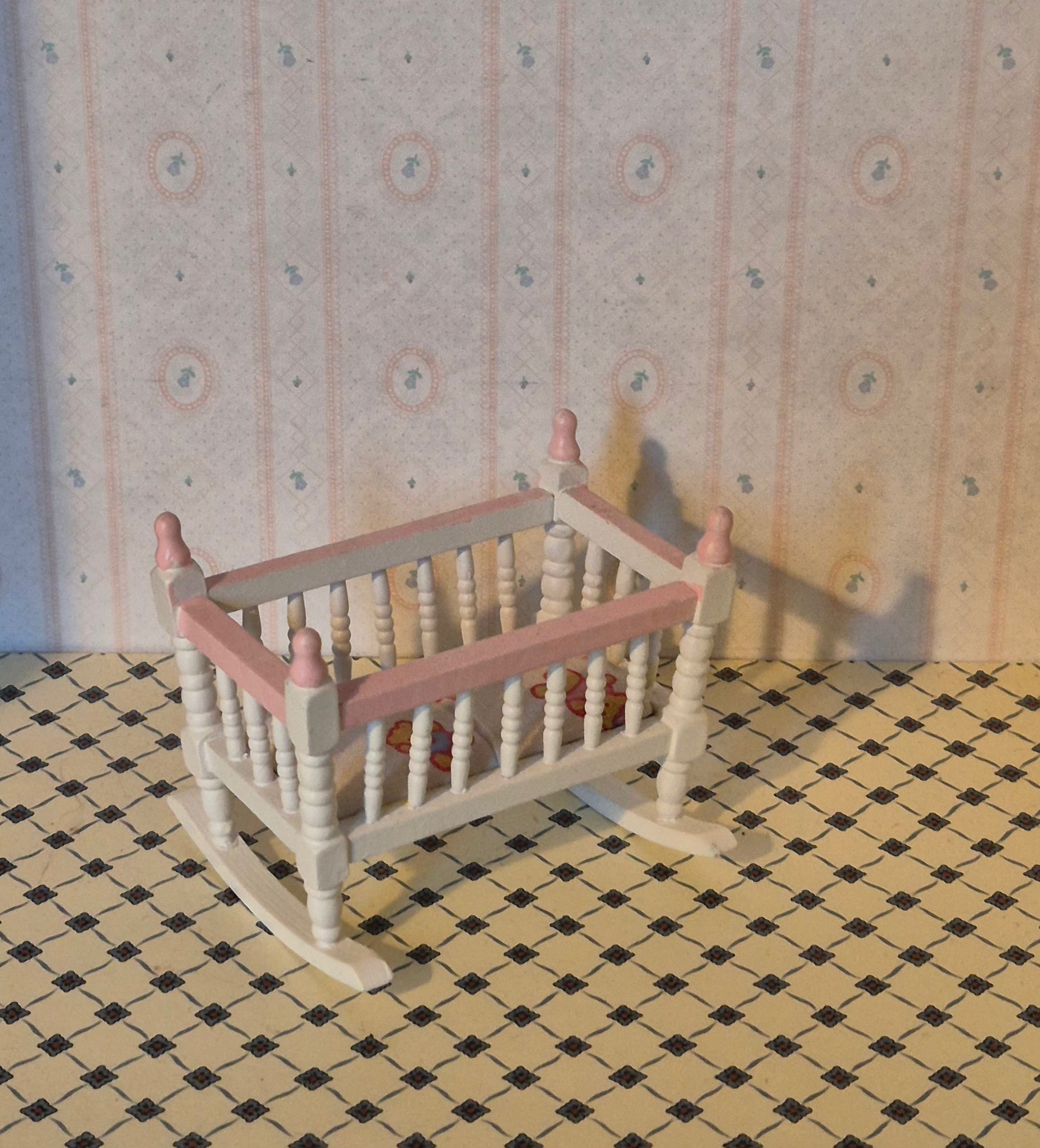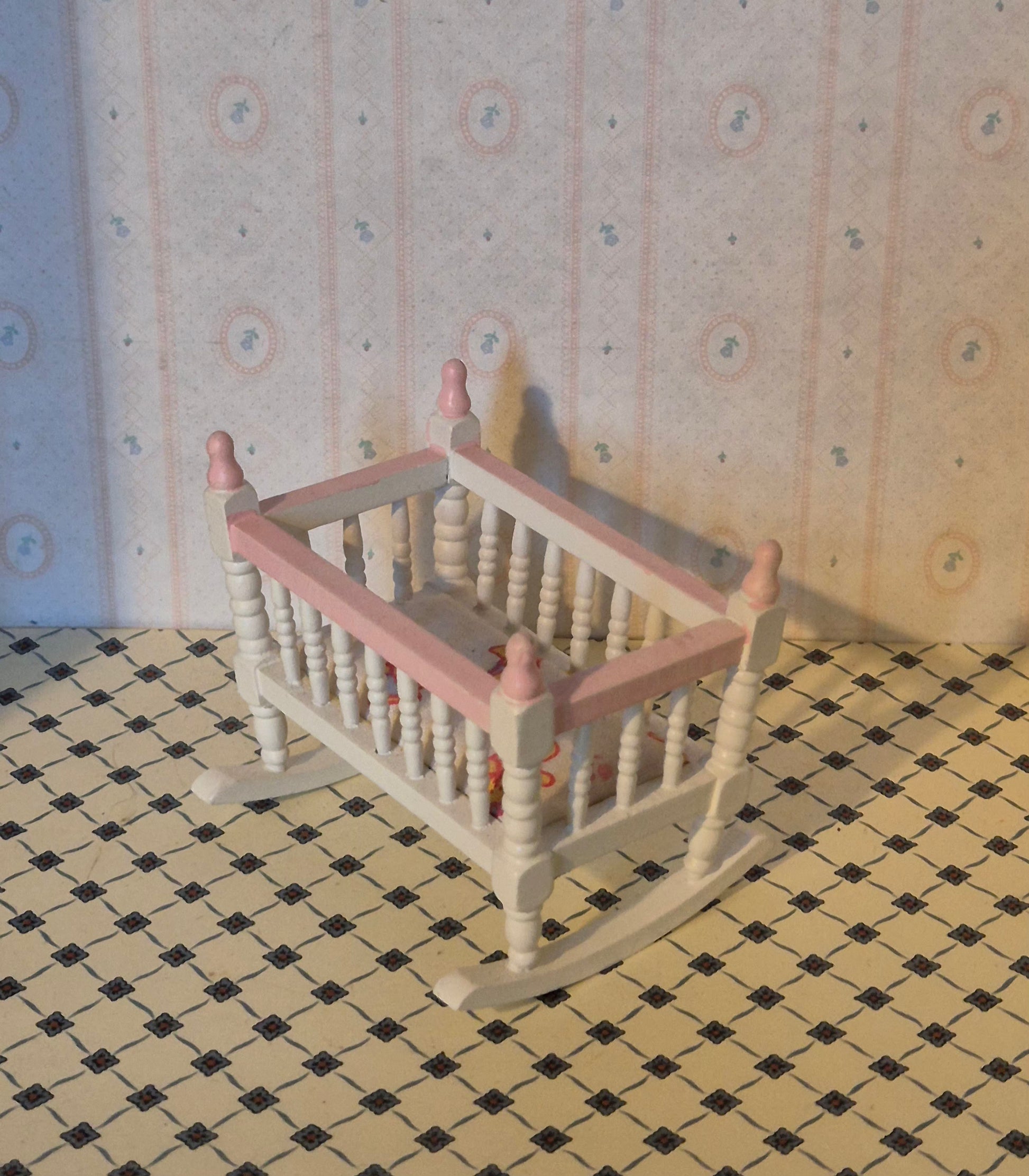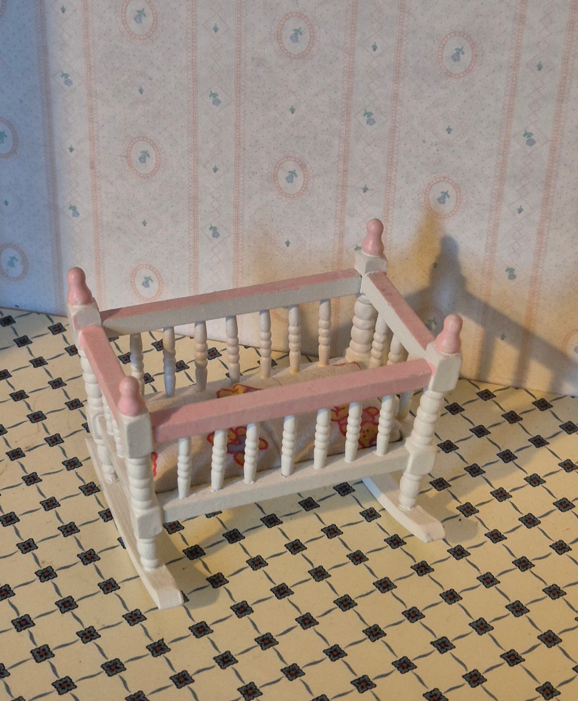 Mindre 1:12 vugge af træ. Pæn stand. Den er hvid og pink.