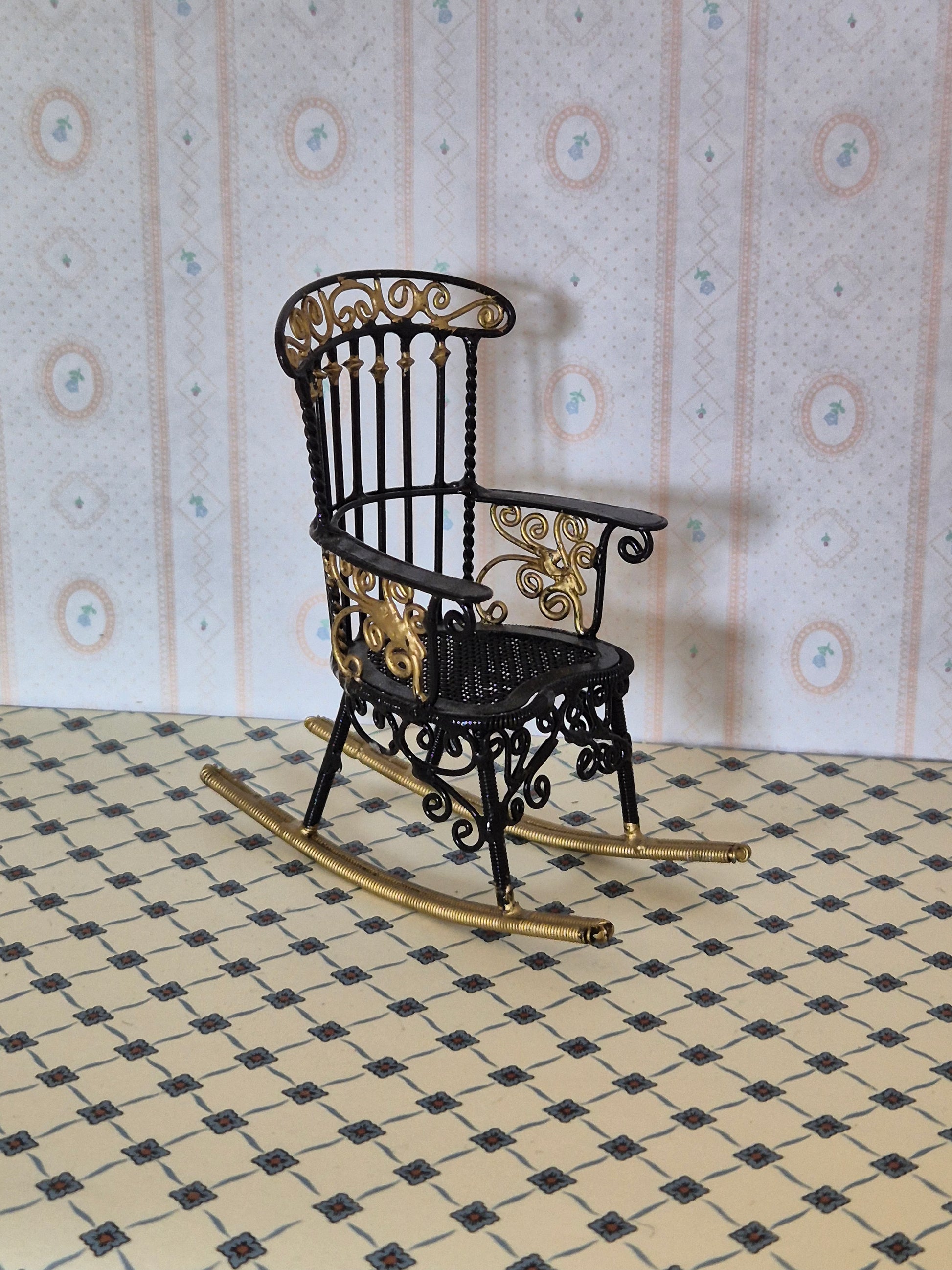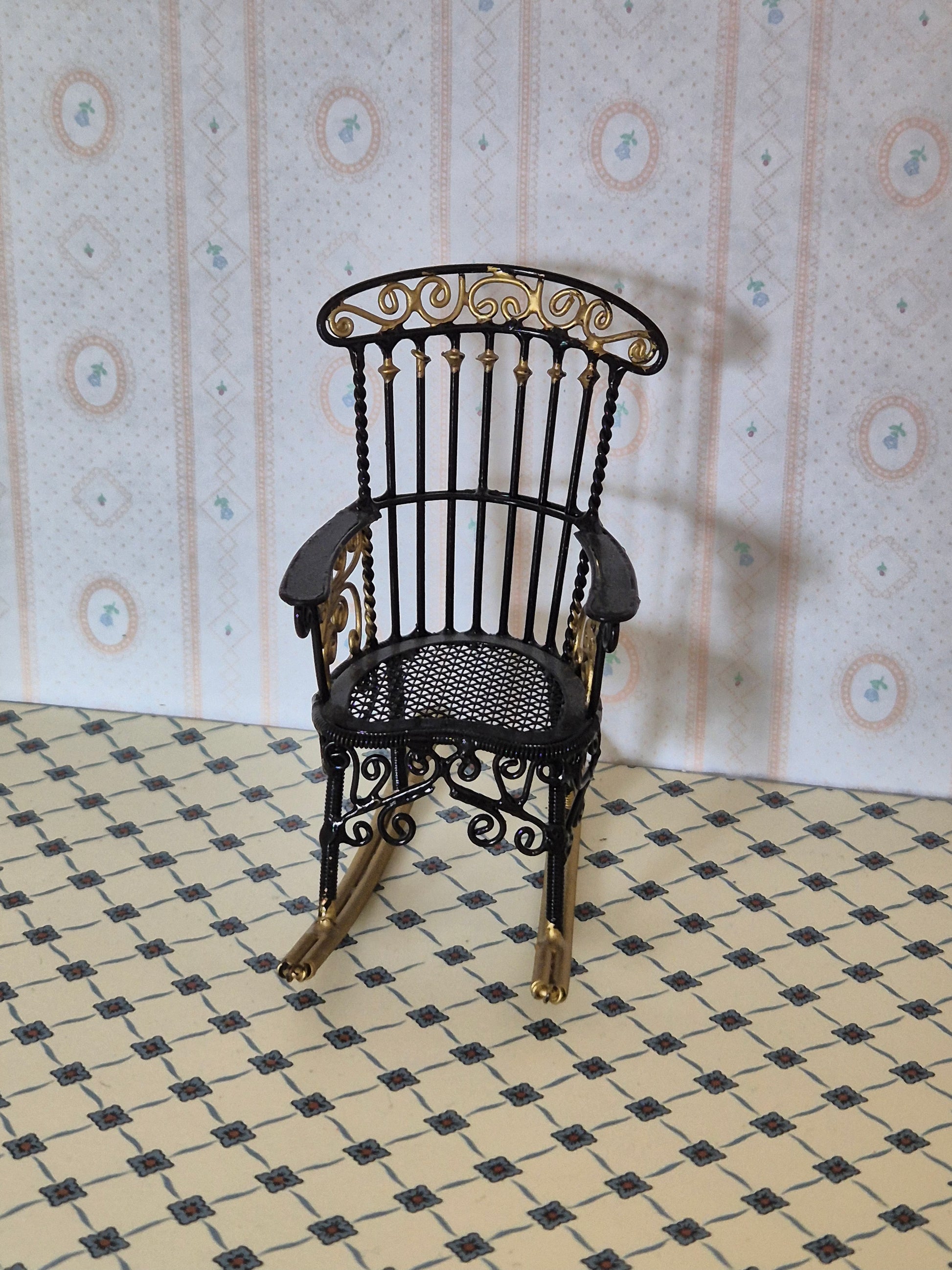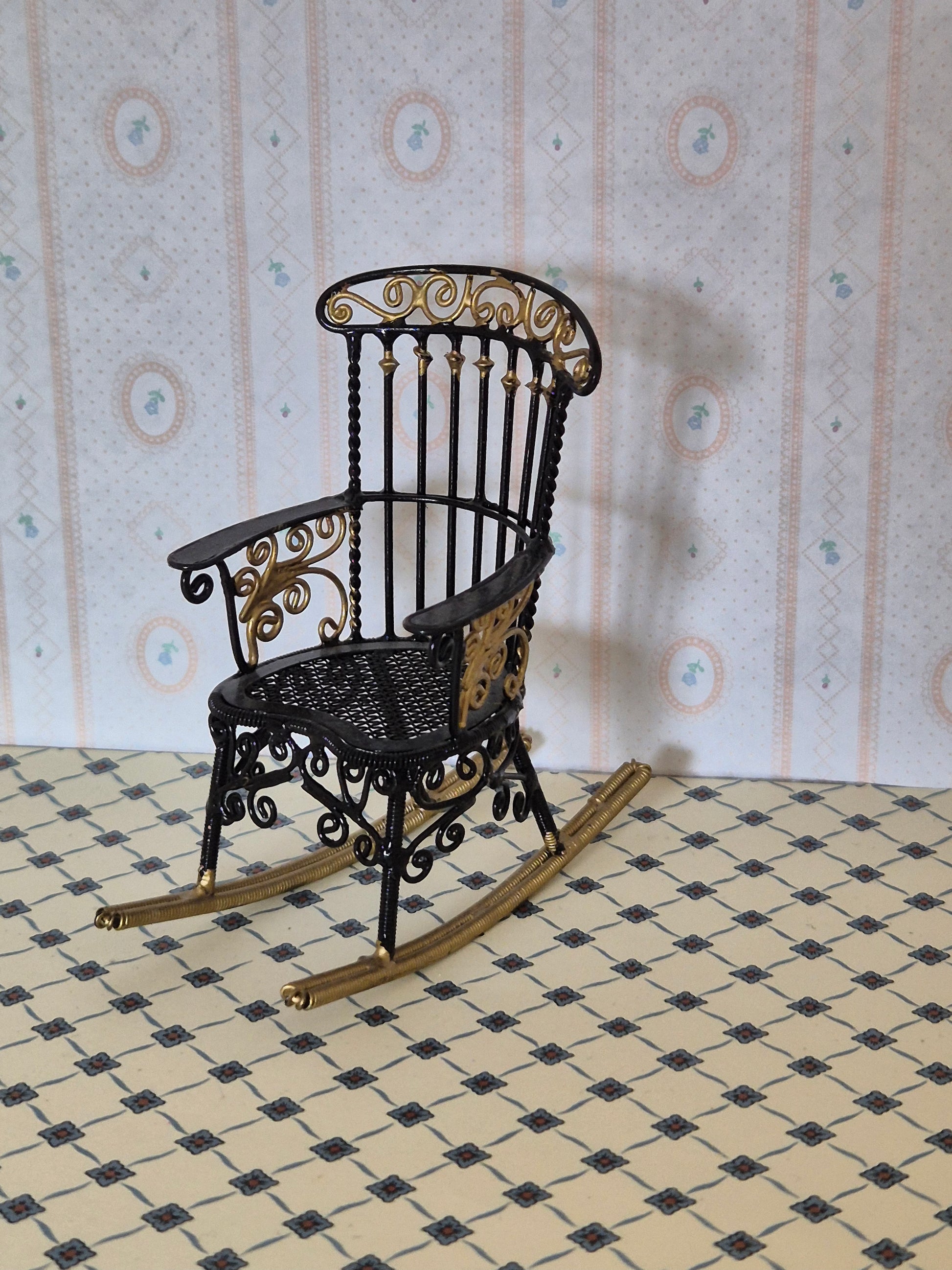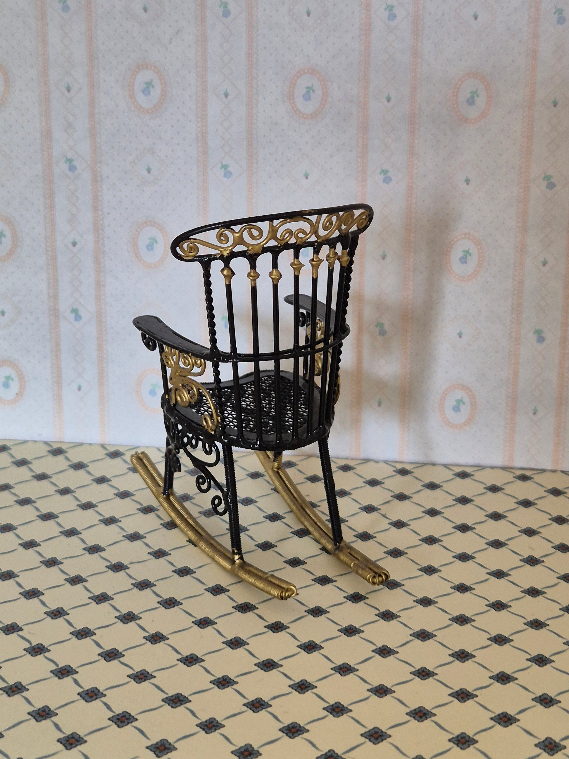 Pæn og smuk gyngestol af metal 1:16. Sort med gyldne detaljer. Virkelig fin
