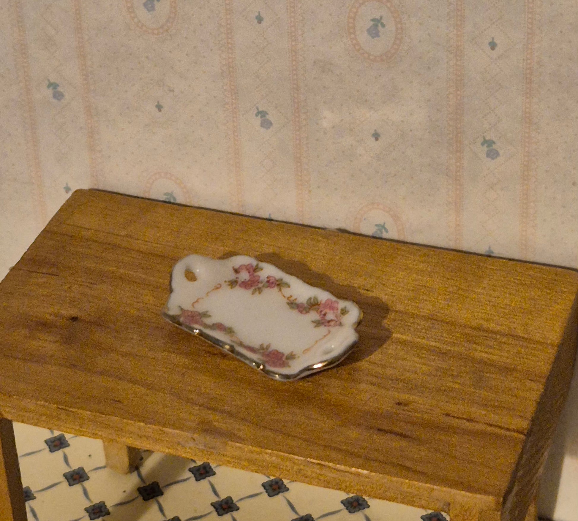 Porcelæn fad med blomstermotiv. Det er ikke så stort, ca 2,2 cm. Der er patina og brugsspor.