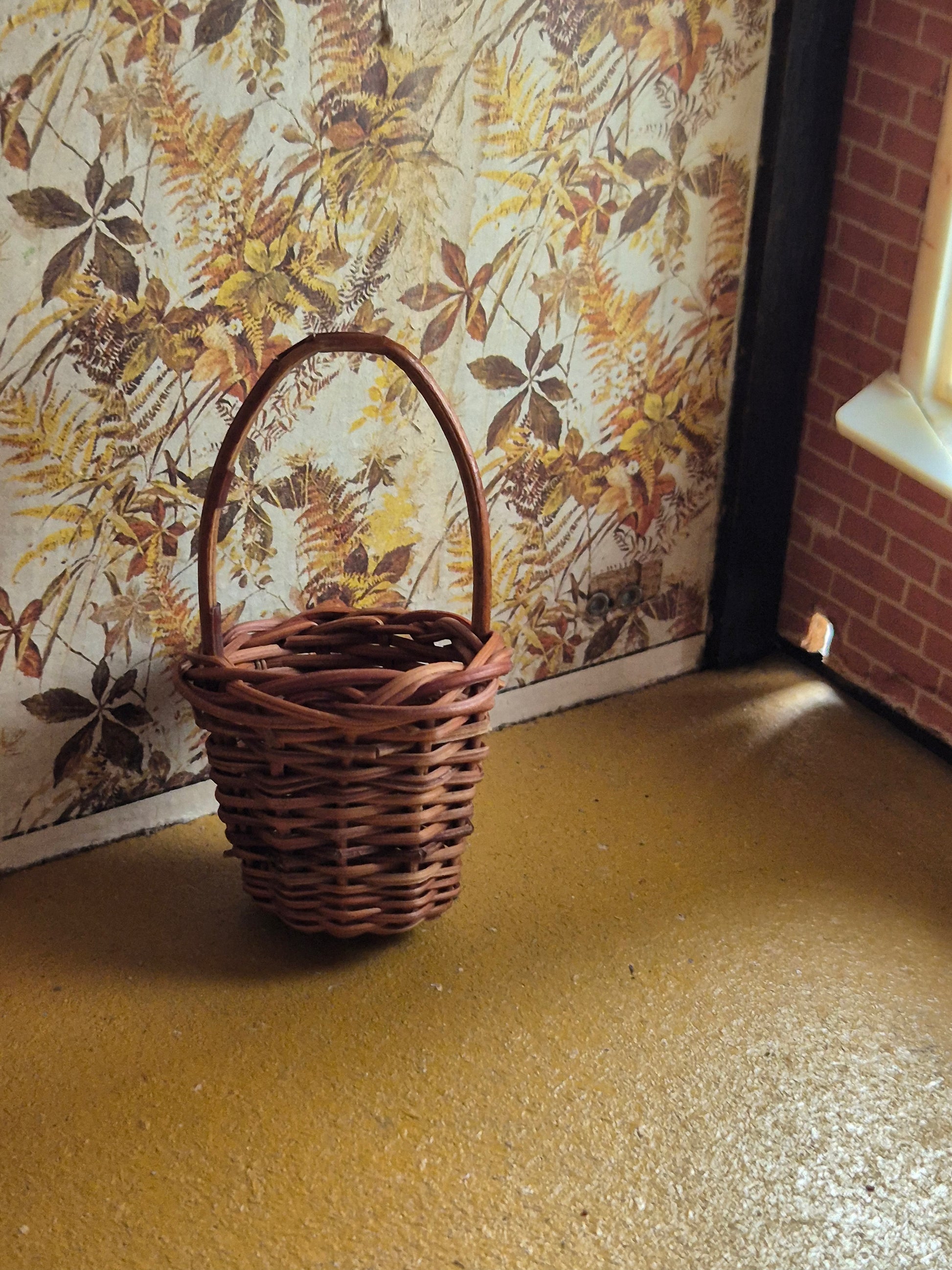 Pæn flettet kurv med smal hank. Mørkebrun.