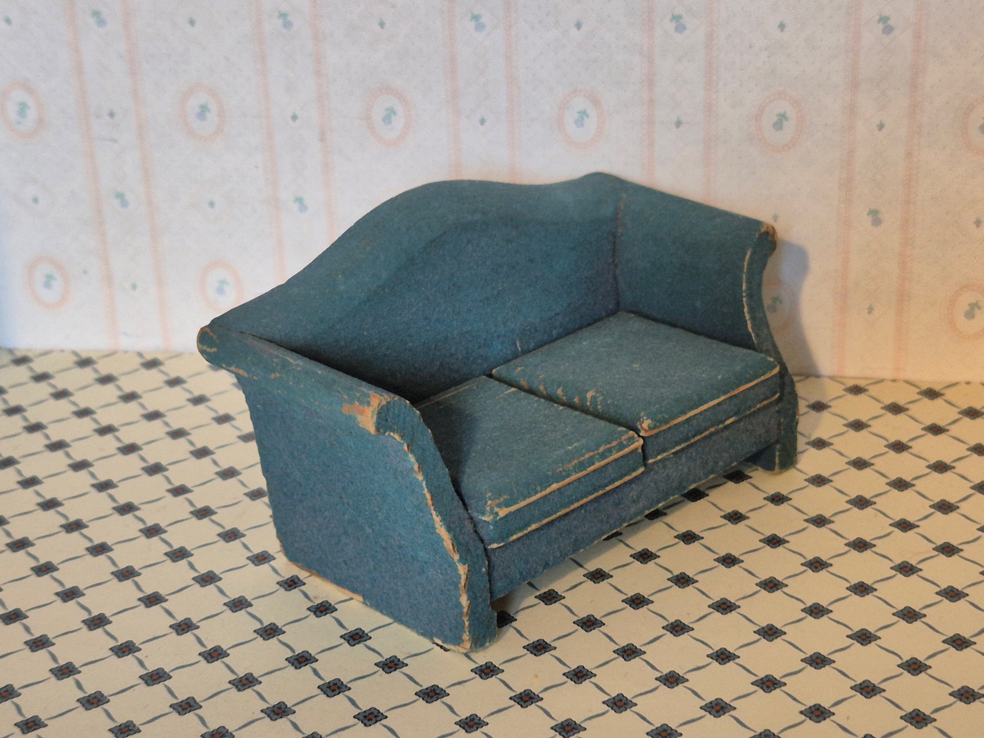 Lerro sofa, ældre, 1:16 i blå af træ fra 1950erne. Den har flere tegn på slid og brugsspor.