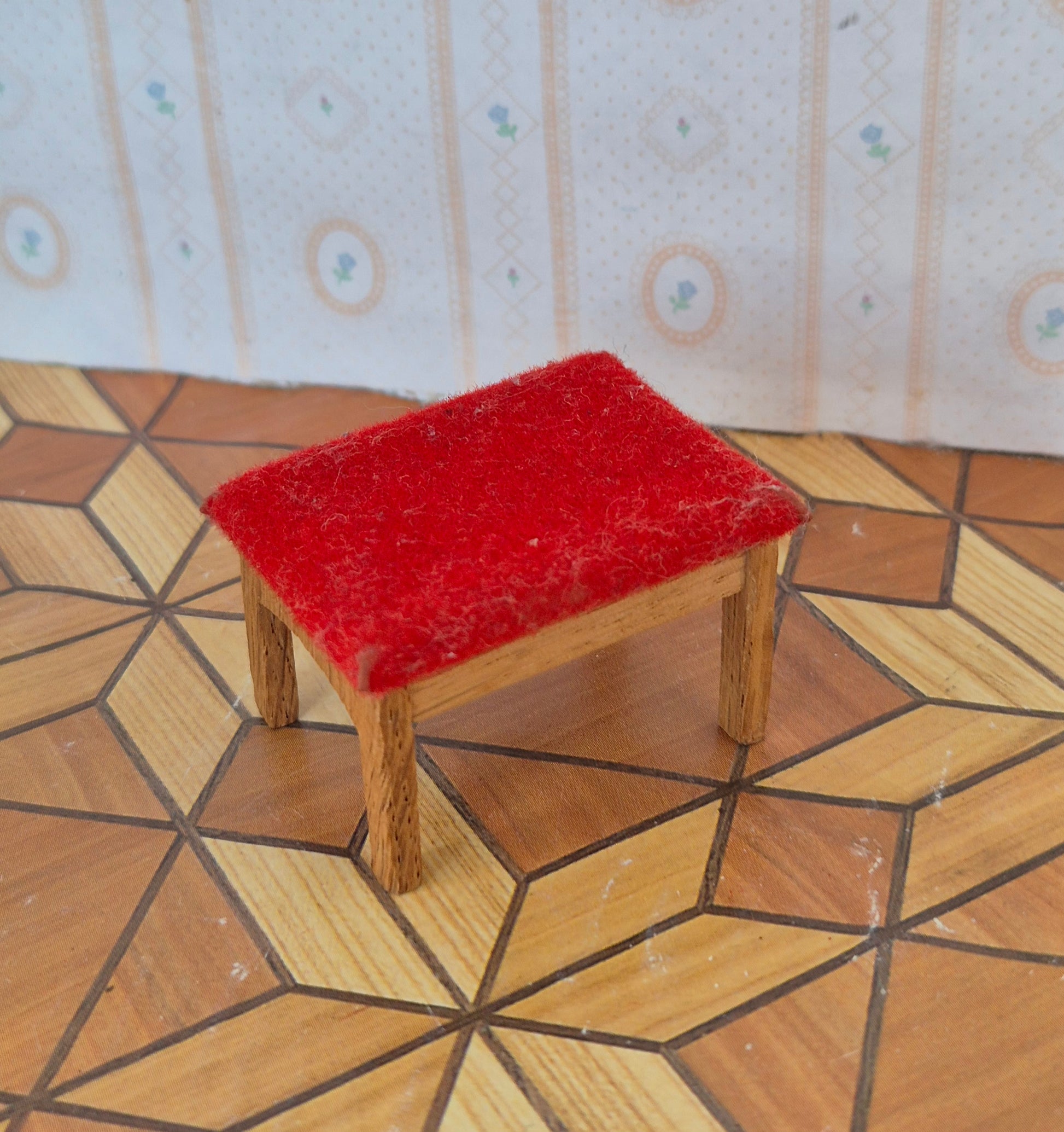 Pæn original fodskammel til lænestol af egetræ med rødt betræk , der er relativt sjælden, af mærket Lisa af Danmark.