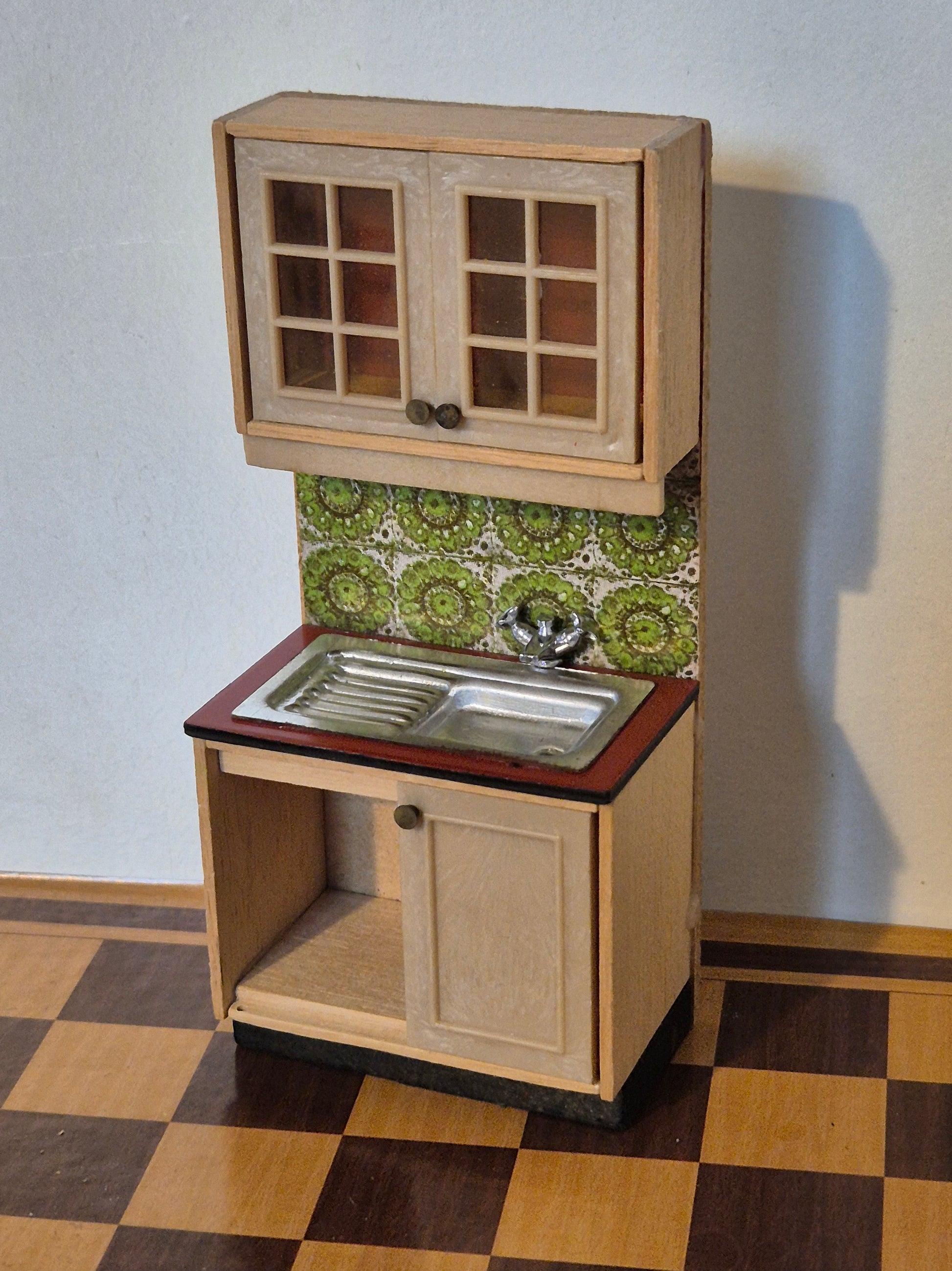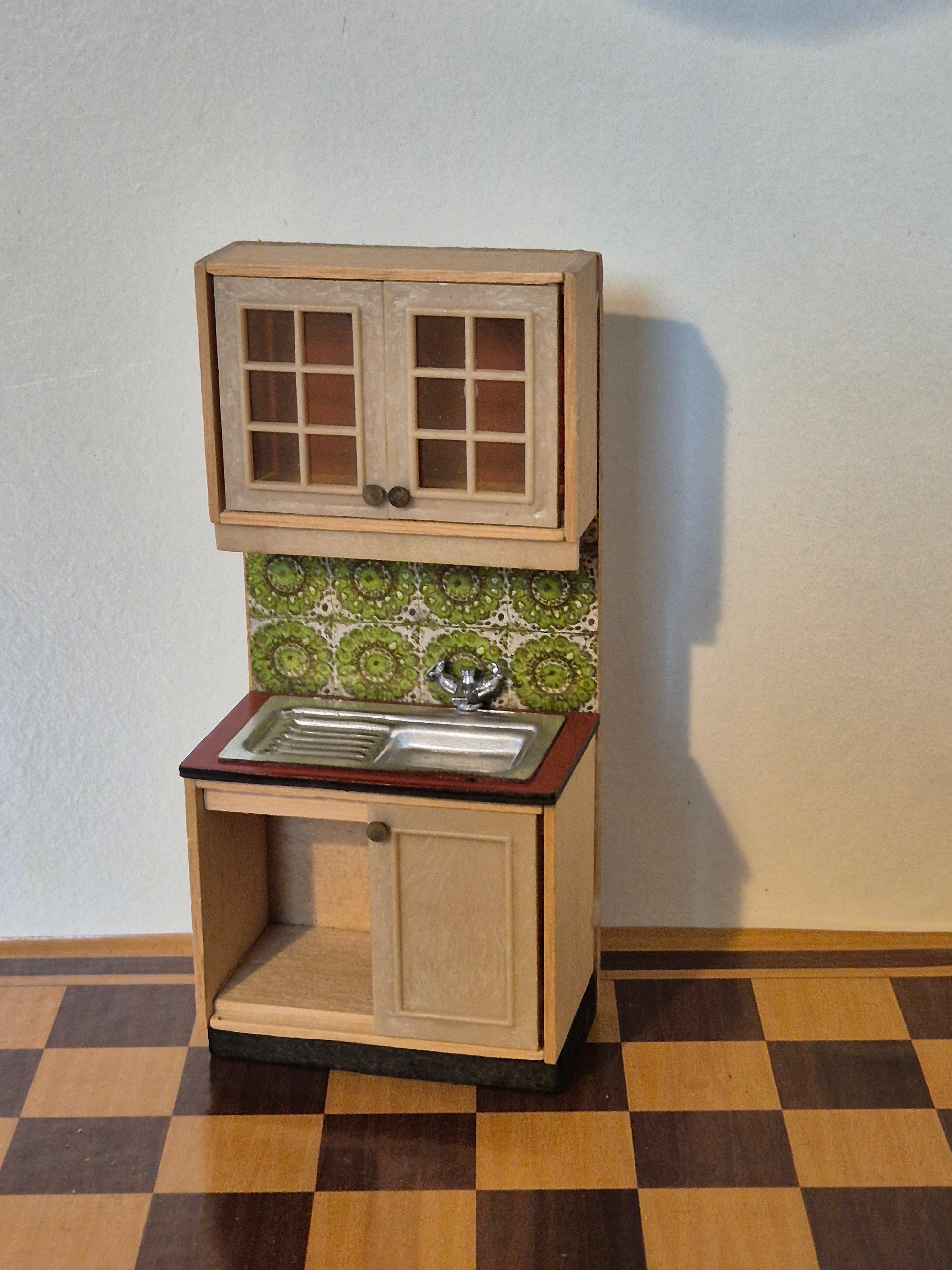 Vintage køkkenvask af Lisa af Danmark str 1:16 i grøn serie, hvor der mangler en låge. Der er spor af brug.