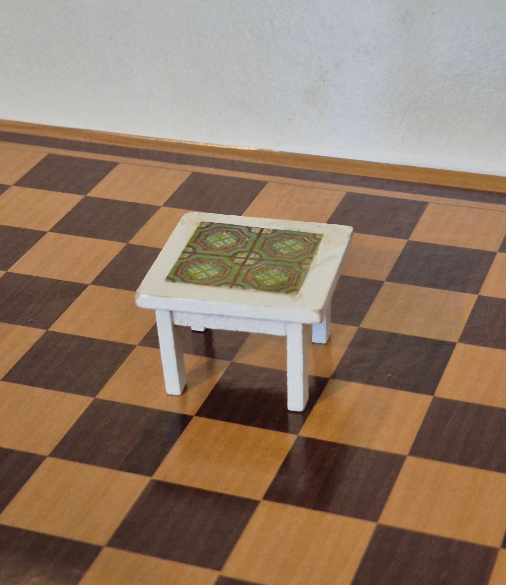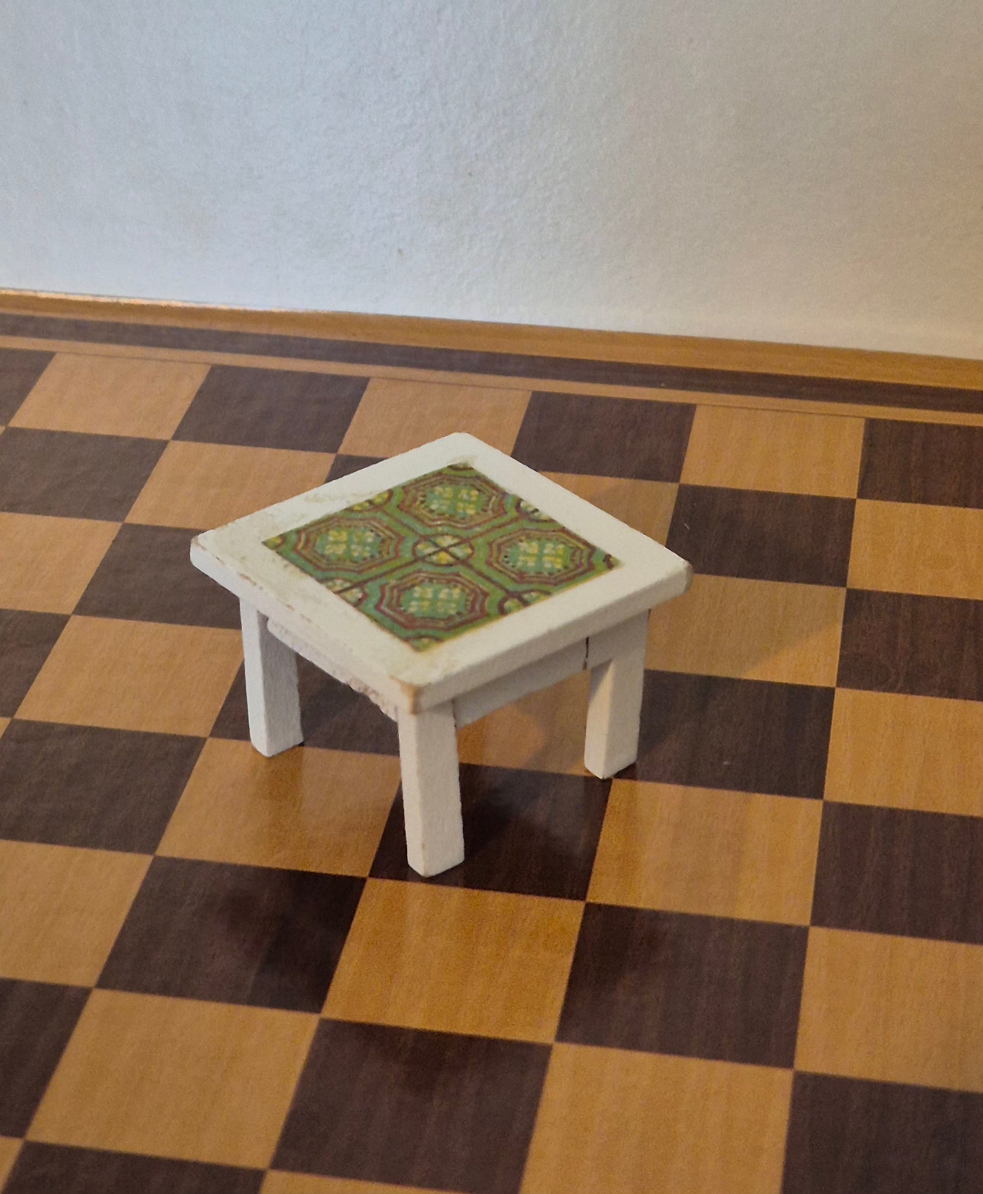 Pænt lille Lisa af Danmark sofabord eller sidebord i hvid med grøn mønster dug. Der er tegn af brug og patina